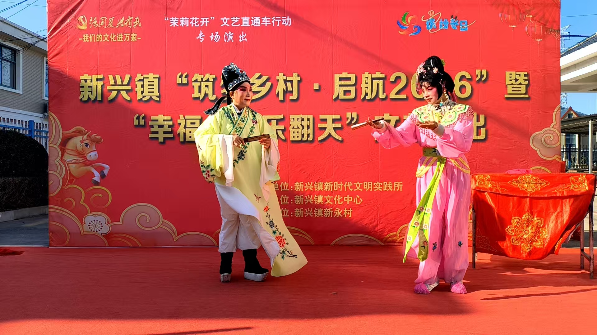 演出在舞蹈《中国美》中开场,翩跹舞姿勾勒出一幅生动的国风画卷;传统二人转与新编《新龙船调》相继登场,幽默诙谐的表演让台下笑声连连;淮剧选段《吴汉三杀》《赵五娘书房会》《金殿传》则深情演绎经典,唱腔醇厚、身段动人,让戏迷们直呼过瘾;舞蹈《唱支山歌给党听》以悠扬旋律传递真挚情感。整场演出持续近两小时,涵盖歌舞、戏曲等多种形式,既扎根传统艺术,又融入时代气息,生动展现出新兴镇群众昂扬向上的精神风貌。