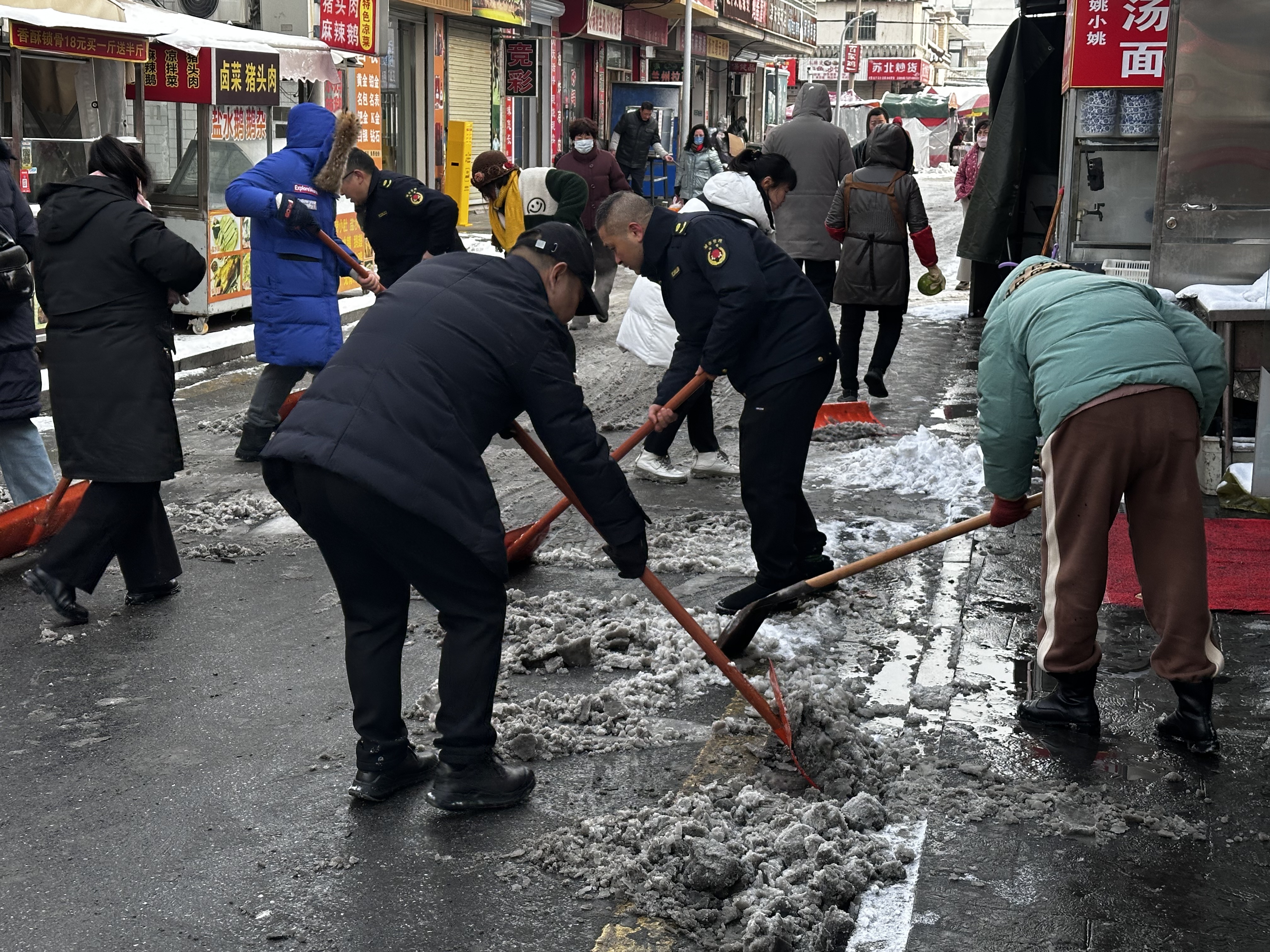清晨,天刚蒙蒙亮,社区工作人员就带着铁锹、雪铲等工具奔赴各个点位。他们重点对辖区内的便民通道、沿街商铺门前等重点区域进行集中清理。在寒风中,大家分工协作,挥舞着工具奋力铲冰除雪。有的负责铲除路面压实的冰层,有的负责将积雪推到路边,有的则配合商铺店主清理门前积雪。经过数小时的奋战,原本湿滑难行的道路被清理出一条条安全通道,保障了居民和商户的正常通行。