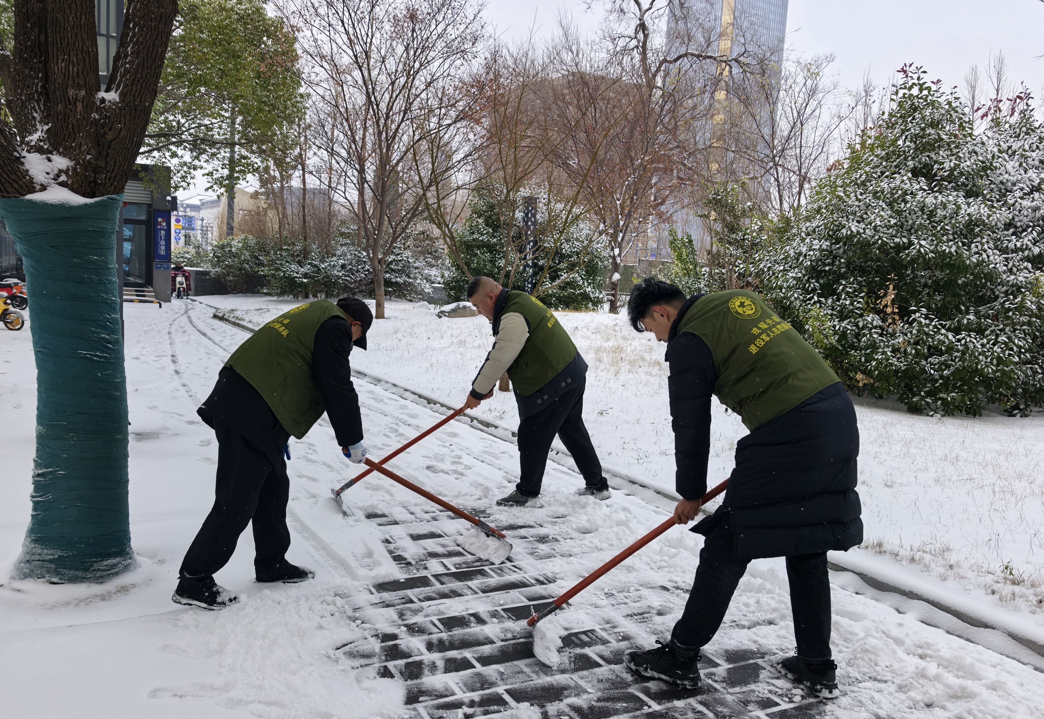 清理现场,退役军人志愿者充分发挥先锋模范作用,带头冲向积雪最厚、最难清理的区域,挥舞铁锹奋力铲除坚冰厚雪;其他志愿者紧随其后,用扫帚细致清扫残留雪渣,分工协作、配合默契,用实际行动诠释着“奉献、友爱、互助、进步”的志愿精神,也彰显了退役军人“退役不褪色、建功新时代”的责任与担当。