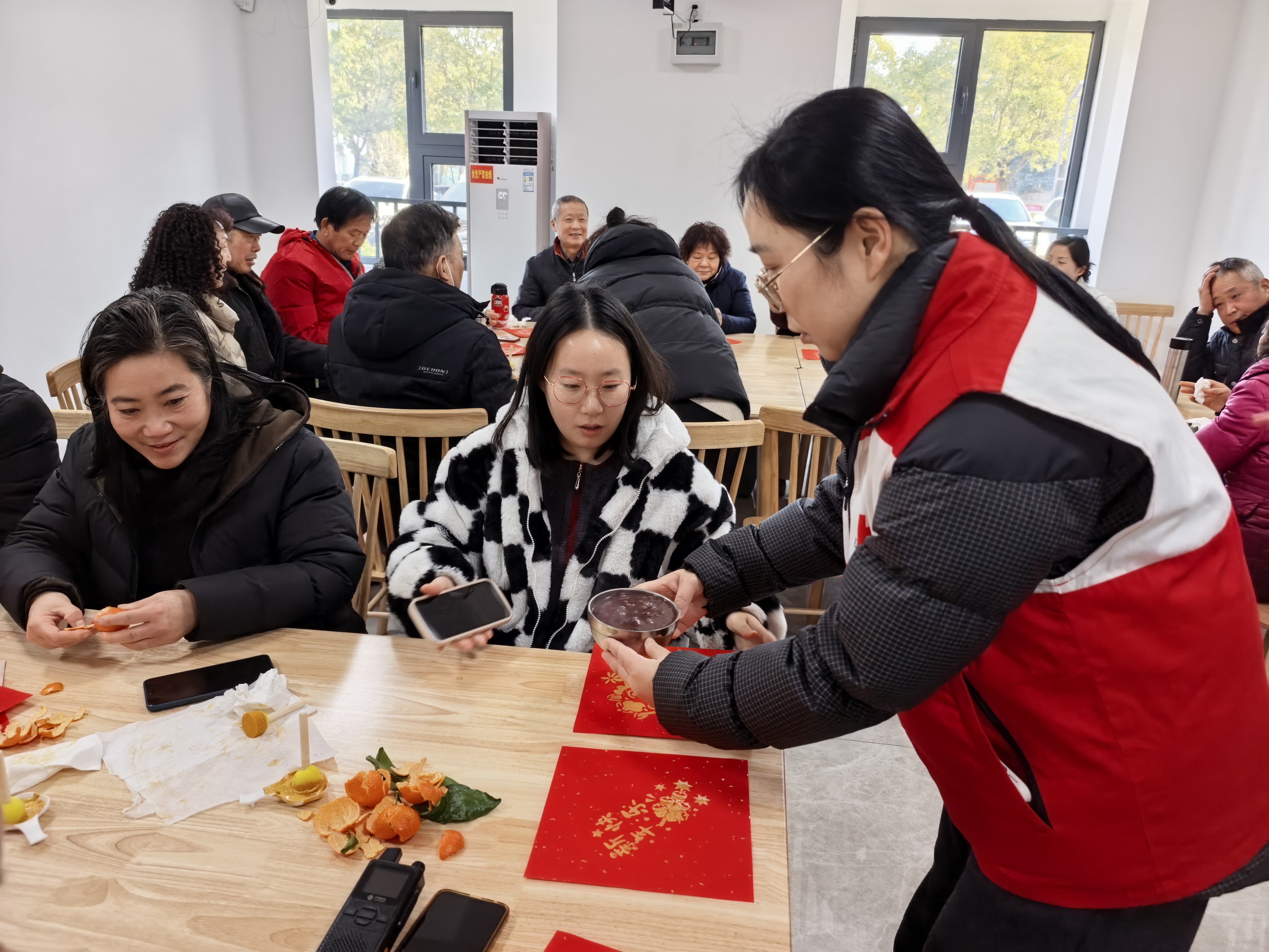 拓印活动结束后,志愿者煮好了一大锅腊八粥,粥里包含红豆、薏米、花生、红枣等多种食材。工作人员将一碗碗热腾腾的腊八粥递到辖区居民的手中,祝愿大家在新的一年里吉祥如意、诸事顺心。