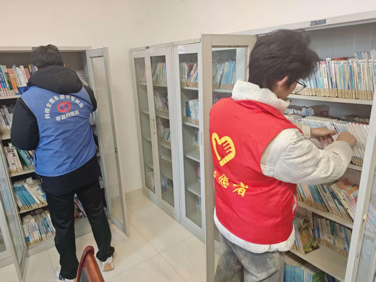 活动中,网格员对全部图书进行盘点核对、分类编号、规范上架;青年志愿者细致开展书架擦拭、环境卫生清理、阅读区域整理。大家各司其职、配合默契,经过集中整理,原本杂乱的书架整齐有序,各类图书一目了然,书屋环境焕然一新。