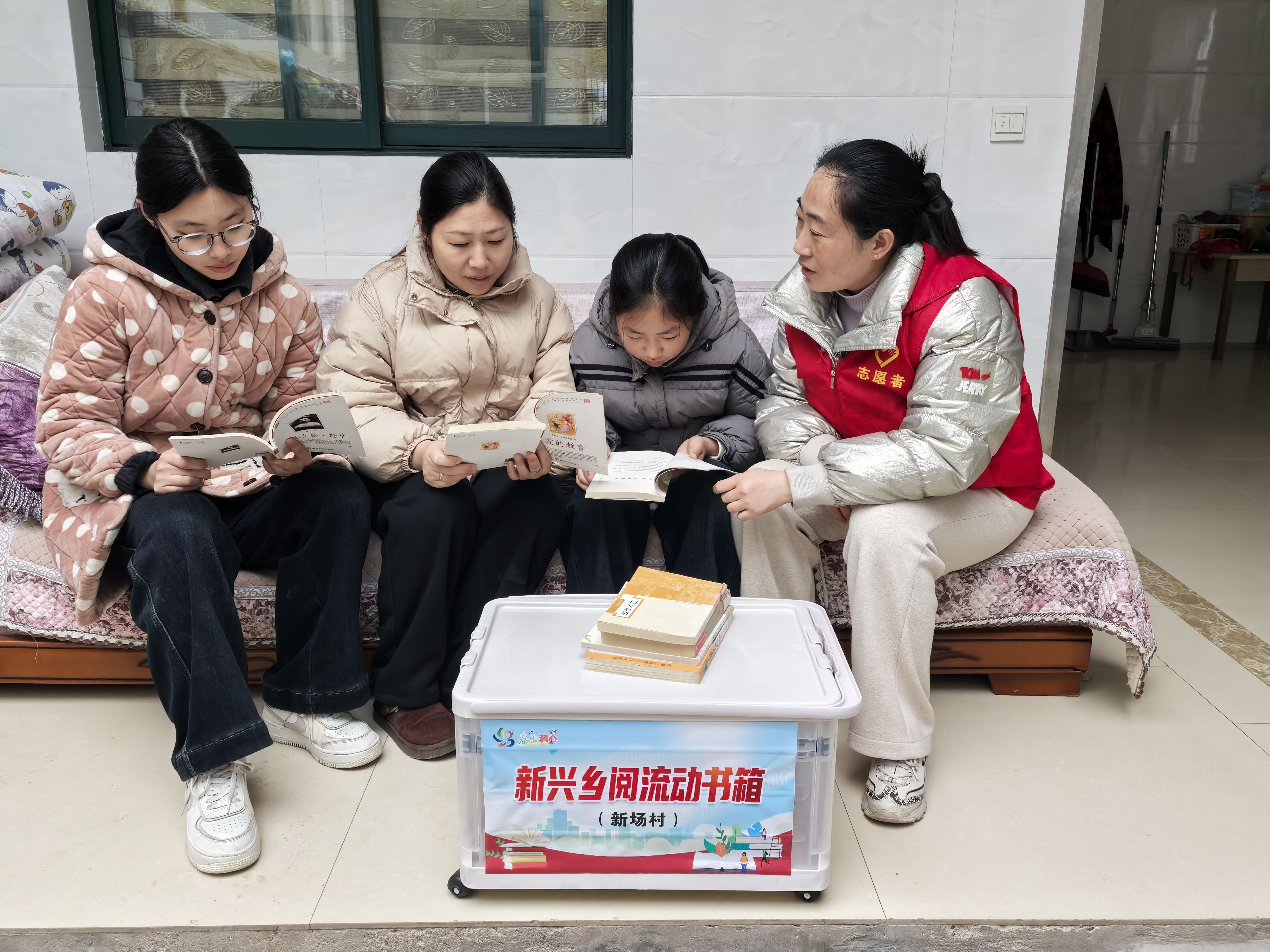 新场村志愿者带着精心准备的“流动书箱”走进群众家中,书箱里,装满了精心挑选的绘本、童话、科普读物以及家庭教育书籍,适合不同年龄段的孩子与家长共同翻阅。活动中,志愿者与家长和孩子围坐在一起,共读一个故事,分享一段感悟。这不仅是一次阅读的引导,更是一段温馨的亲子陪伴时光。新场村希望通过这种面对面、心贴心的方式,让书籍成为连接家庭与社区的纽带,让阅读的种子在孩子们心中生根发芽。