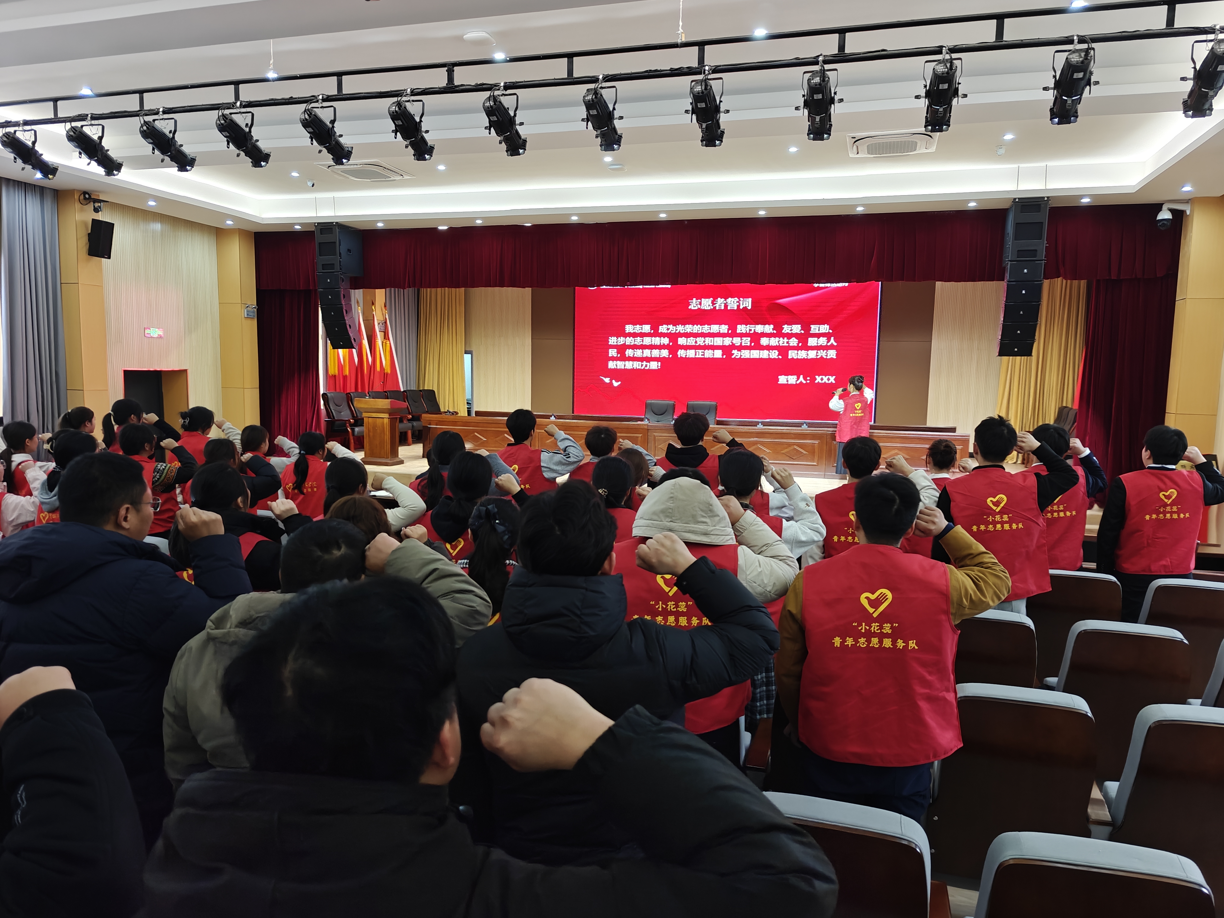在思想动员的基础上,校地双方进一步通过机制建设推动合作走深走实。便仓镇党委副书记李楠与盐城师范学院团委副书记刘成现场签署了《校地共建志愿服务基地协议书》,并共同为志愿服务基地揭牌,标志着双方在资源共享与实践育人方面迈出关键一步。紧接着,便仓镇组织委员钱静文与盐城师范学院商学院党委副书记秦圣阳为新成立的“小花蕊”青年志愿服务队授旗。全体志愿者举起右拳集体宣誓,表达了投身基层服务的坚定决心。