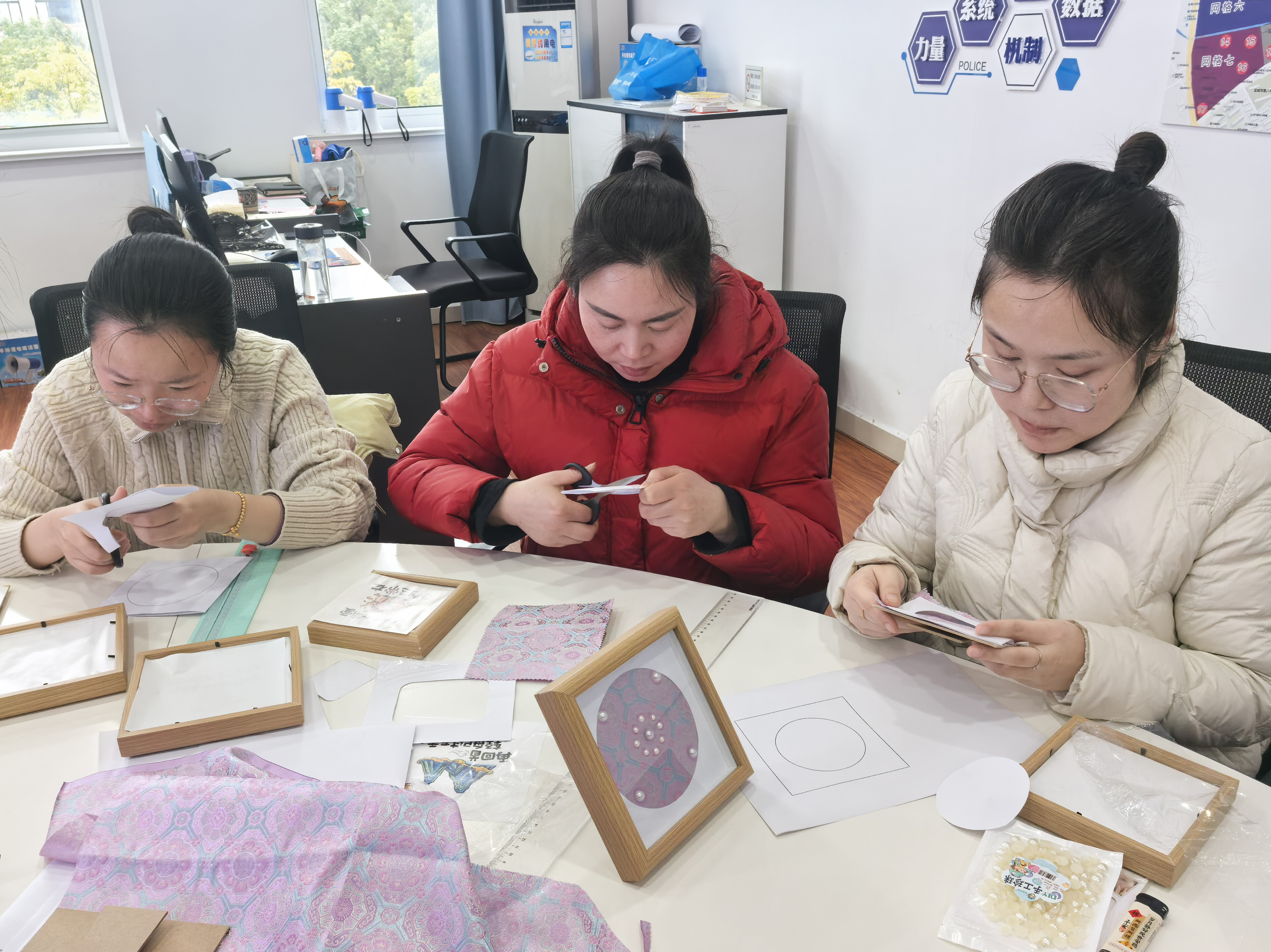 活动现场,大家积极互动、协作,氛围温馨热烈。有的挑选布料,有的将珠子点缀在锦缎上,还有的在老师帮助下调整相框细节。大家沉浸在手工创作乐趣中,随着指尖流转,精美珠锦作品成型,平凡布料和珠子被赋予新生命。