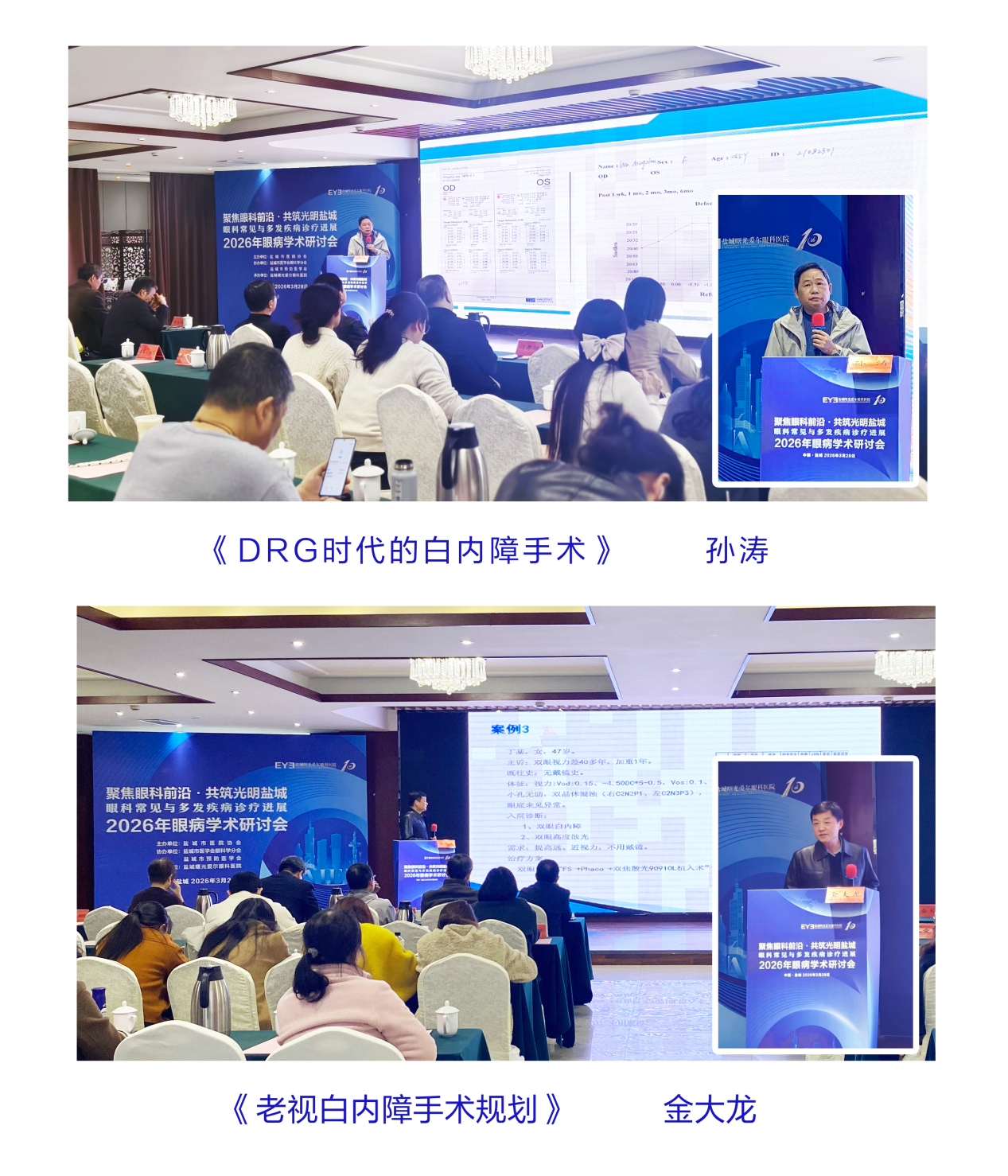 白内障板块中,盐城市医学会眼科学分会主任委员孙涛以《DRG时代的白内障手术》为题,深入探讨了医保支付改革背景下,白内障手术的规范化诊疗路径与发展方向;盐城曙光爱尔眼科医院院长金大龙围绕《老视白内障手术规划》,详细阐述了精准化手术规划对提升患者术后视觉质量的核心意义。