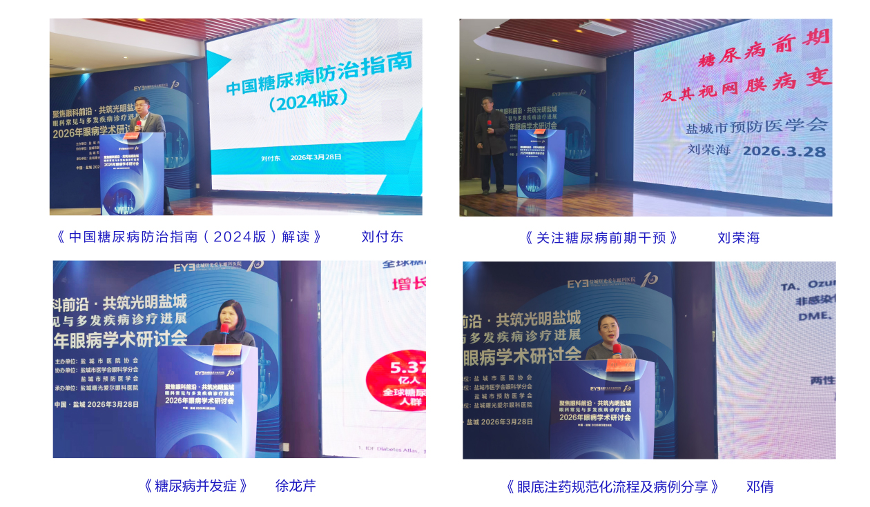 眼底板块中,盐城市预防医学会慢性病防治专业委员会副主任委员刘付东对《中国糖尿病防治指南(2024版)》进行深度解读,重点强调了糖尿病眼病早期筛查与干预的重要性;盐城市预防医学会会长刘荣海以《关注糖尿病前期干预》为题,呼吁行业加强慢病管理关口前移,筑牢眼病防治第一道防线;五星社区卫生服务中心副主任医师徐龙芹结合基层医疗实践,分享了《糖尿病并发症》的临床防治经验;盐城曙光爱尔眼科医院主治医师邓倩通过《眼底注药规范化流程及病例分享》,直观展示了眼底病规范化治疗的具体路径与临床成效。