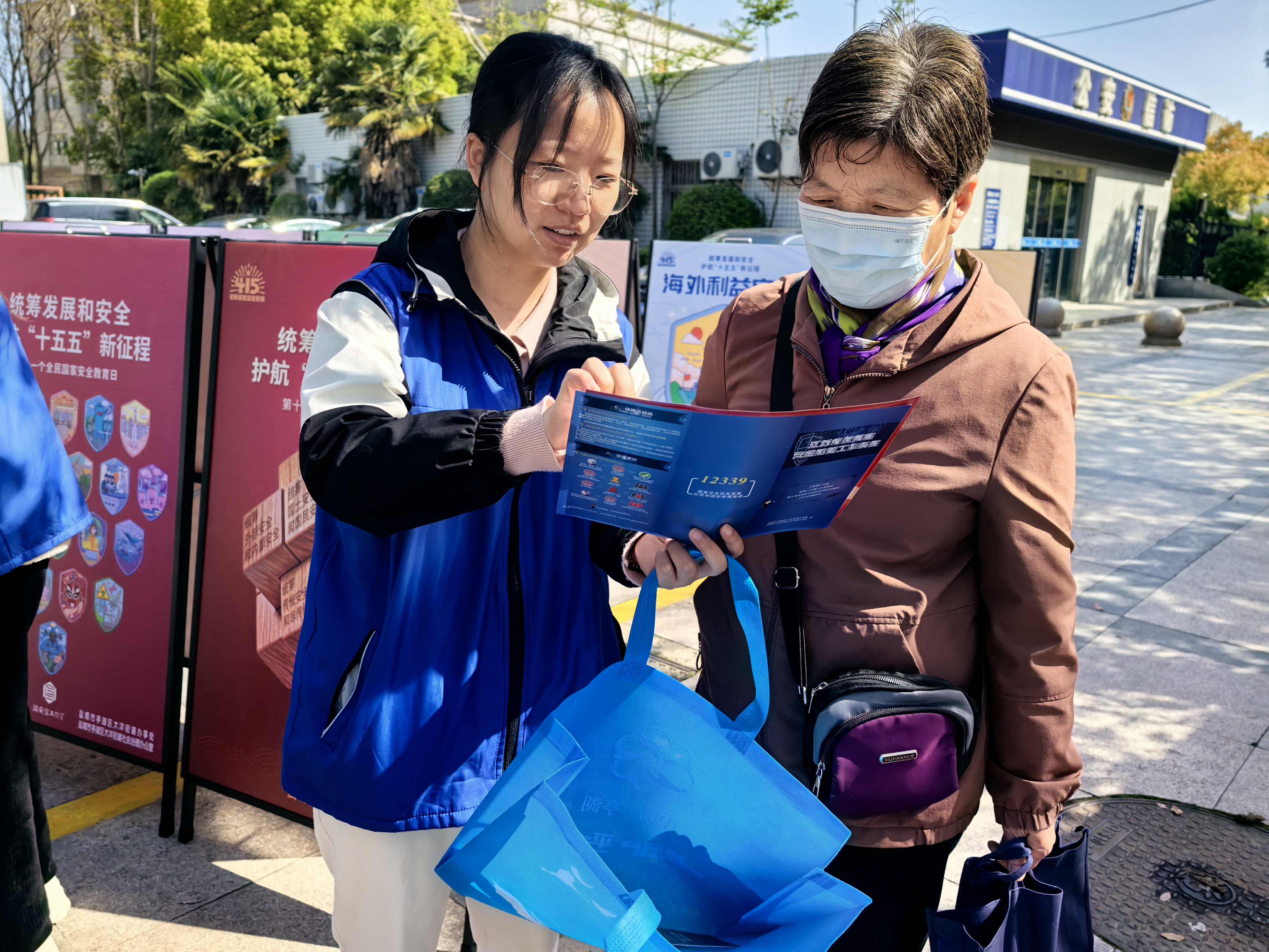 活动现场,社区网格员满怀热情地搭建咨询台、竖起主题展板,并将宣传手册与精美的环保袋整齐摆放,吸引众多居民驻足。展板上“统筹发展和安全护航‘十五五’新征程”的标语格外醒目,工作人员结合图文并茂的资料,以通俗易懂的语言,详细讲解国家安全相关法律法规,并对网络安全、反诈防骗等与生活密切相关的安全要点逐一进行剖析。居民一边领取资料,一边踊跃提问,工作人员现场答疑解惑、剖析热点问题,以耐心的讲解使“国家安全,人人有责”的理念深入人心,让每位参与者都成为国家安全的积极倡导者与坚定守护者。