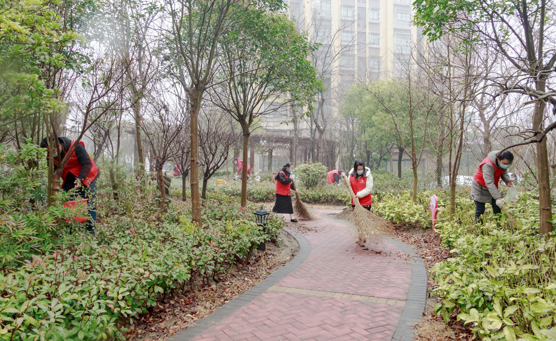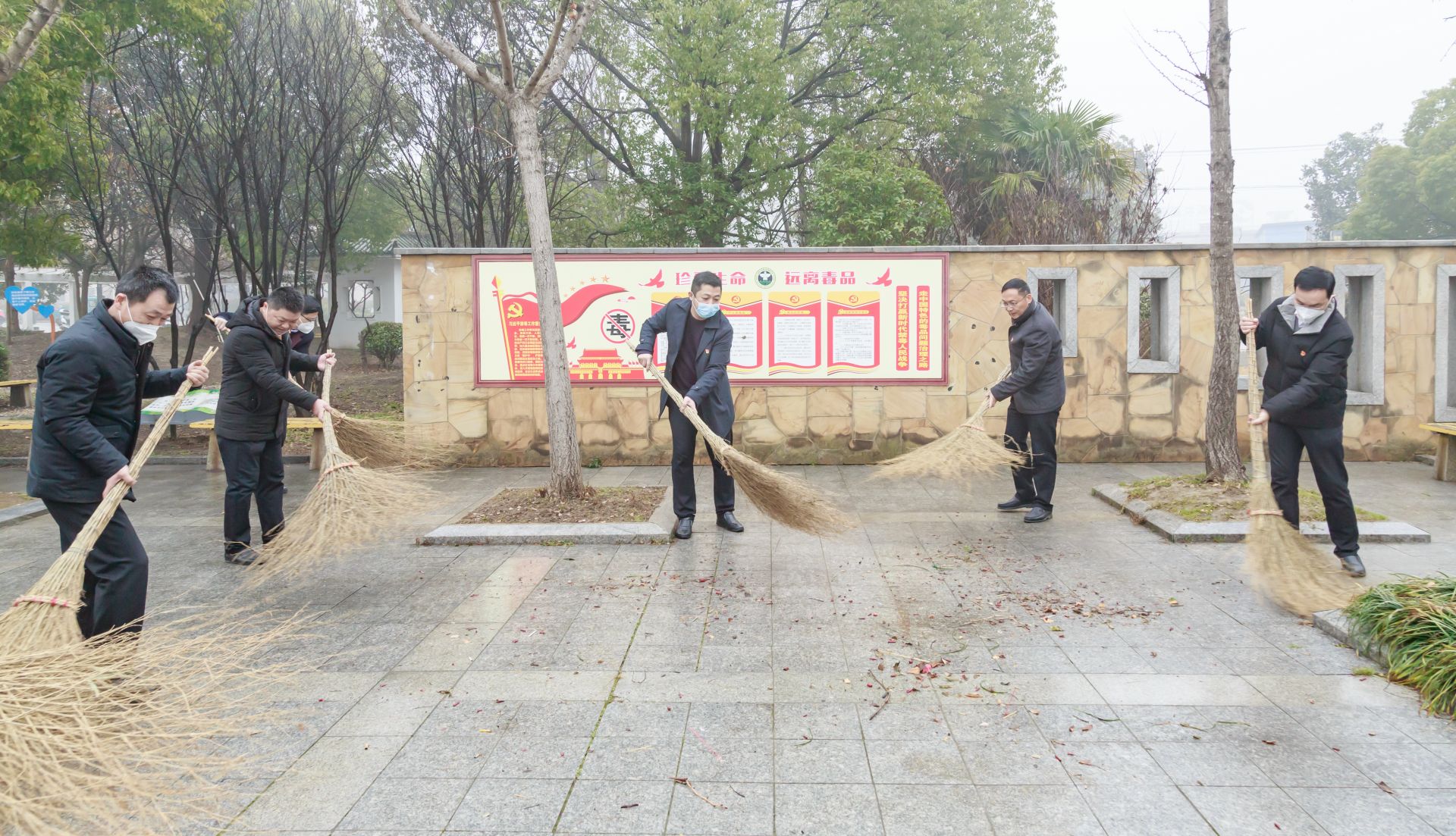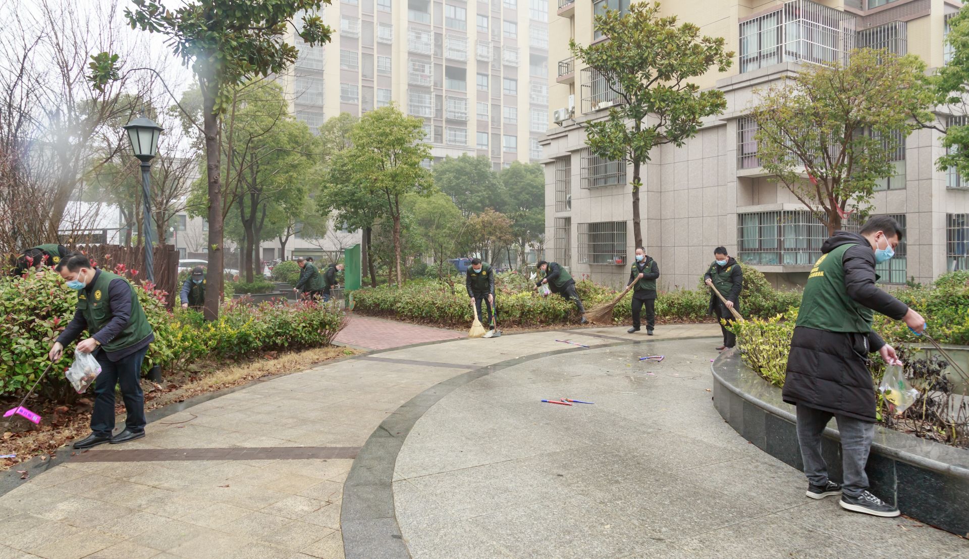 启动仪式后,19支各志愿服务队举旗依次出征,赴各点位开展清扫行动,镇三套班子成员带头在街心公园进行清理打扫。