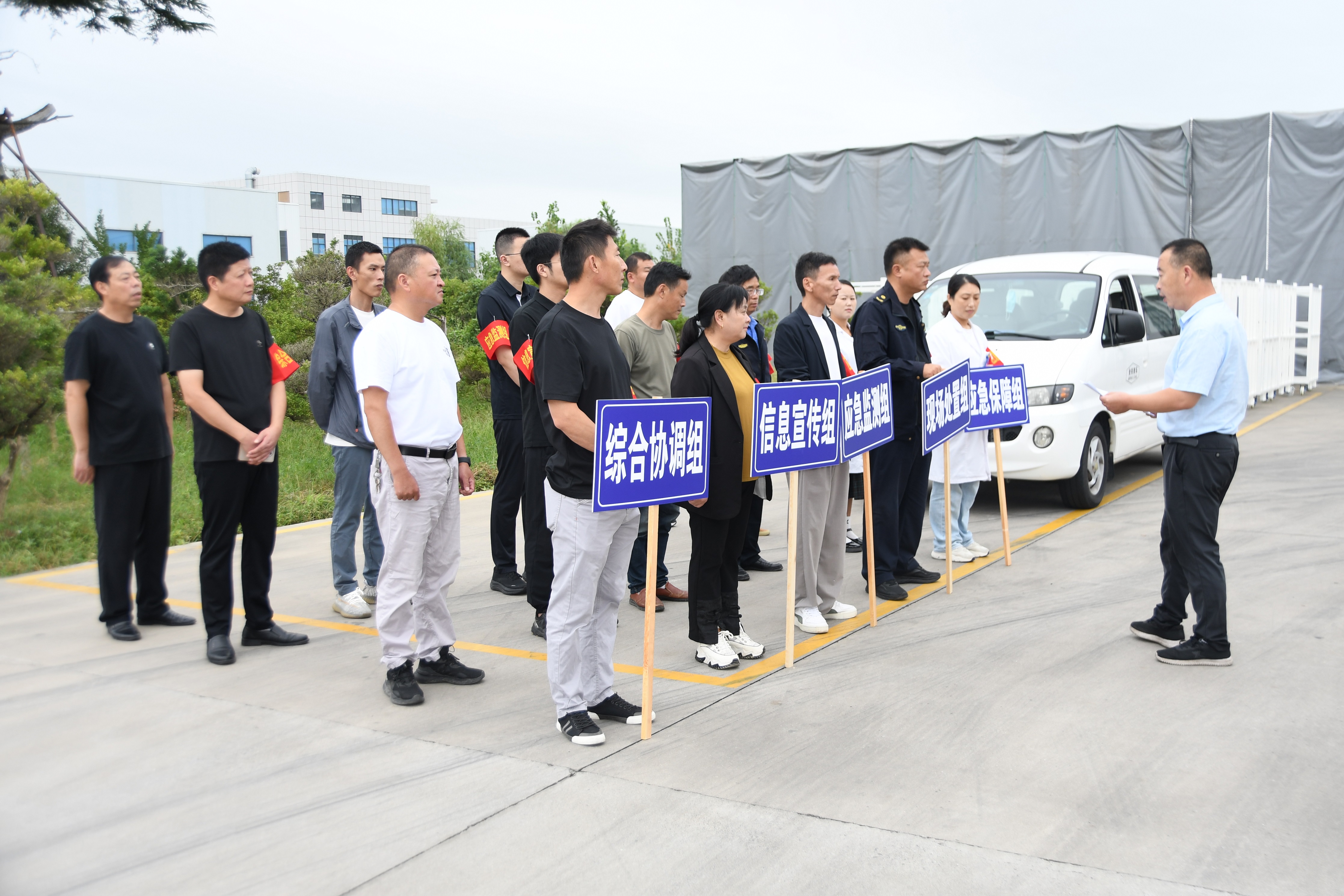 各应急小组迅速行动:综合协调组对下风向150米区域设置警戒带隔离,疏散区域人员、熄火车辆、停止施工,维持现场秩序;现场处置组将晕倒人员转移至上风口急救,协调车辆送医并联系120中途救护;应急保障组携带正压消防空气呼吸器、防化服等器材到场支援;现场处置组同步开展堵漏作业,启动电动消防泵以消防水炮稀释泄漏硫酸;应急监测组持续监测现场硫酸浓度,及时反馈数据;信息宣传组按指令做好事件及救援情况的对外发布。在泄漏点控制后,消防水枪继续喷淋15分钟,产生的消防水全部导入应急池,交由有资质部门后续处置,演练全程紧张有序、衔接顺畅。待泄漏点完全控制后,消防水枪继续喷淋15分钟,产生的消防水全部导入应急池暂存,后续将委托有资质部门规范处置。
