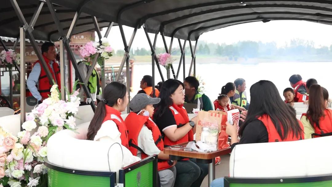 此次活动,从航线到体验都藏着精心设计的巧思。游船从如意港码头出发,一路循着蟒蛇河的粼粼波光驶向耕读人家,最后再换乘小火车返程,形成“游船赏景+陆地休闲”的一站式游览闭环。为了让体验更具水乡风情,游船被精心装扮,鲜艳花簇点缀船身,丝绸幔布随风轻扬,仿古灯笼悬挂两侧,一靠近便仿佛穿越进雅致的江南画卷;船舱内部则摆放着古风桌椅,木质纹理与柔和灯光相映,坐下便能感受慢时光里的水乡惬意。