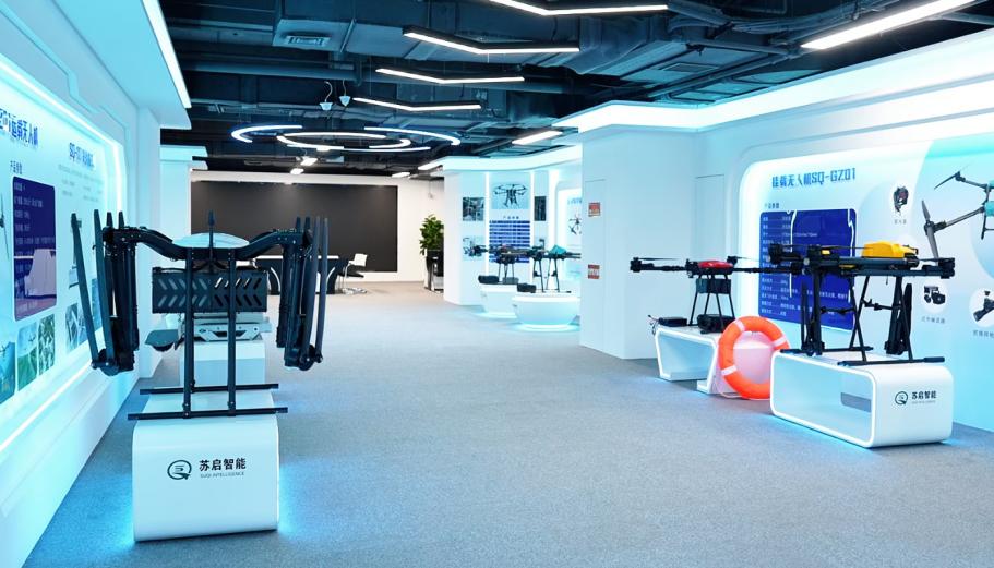 (江苏苏启智能科技有限公司展厅内,适配不同场景的无人机阵列整齐排布。 商林生摄)