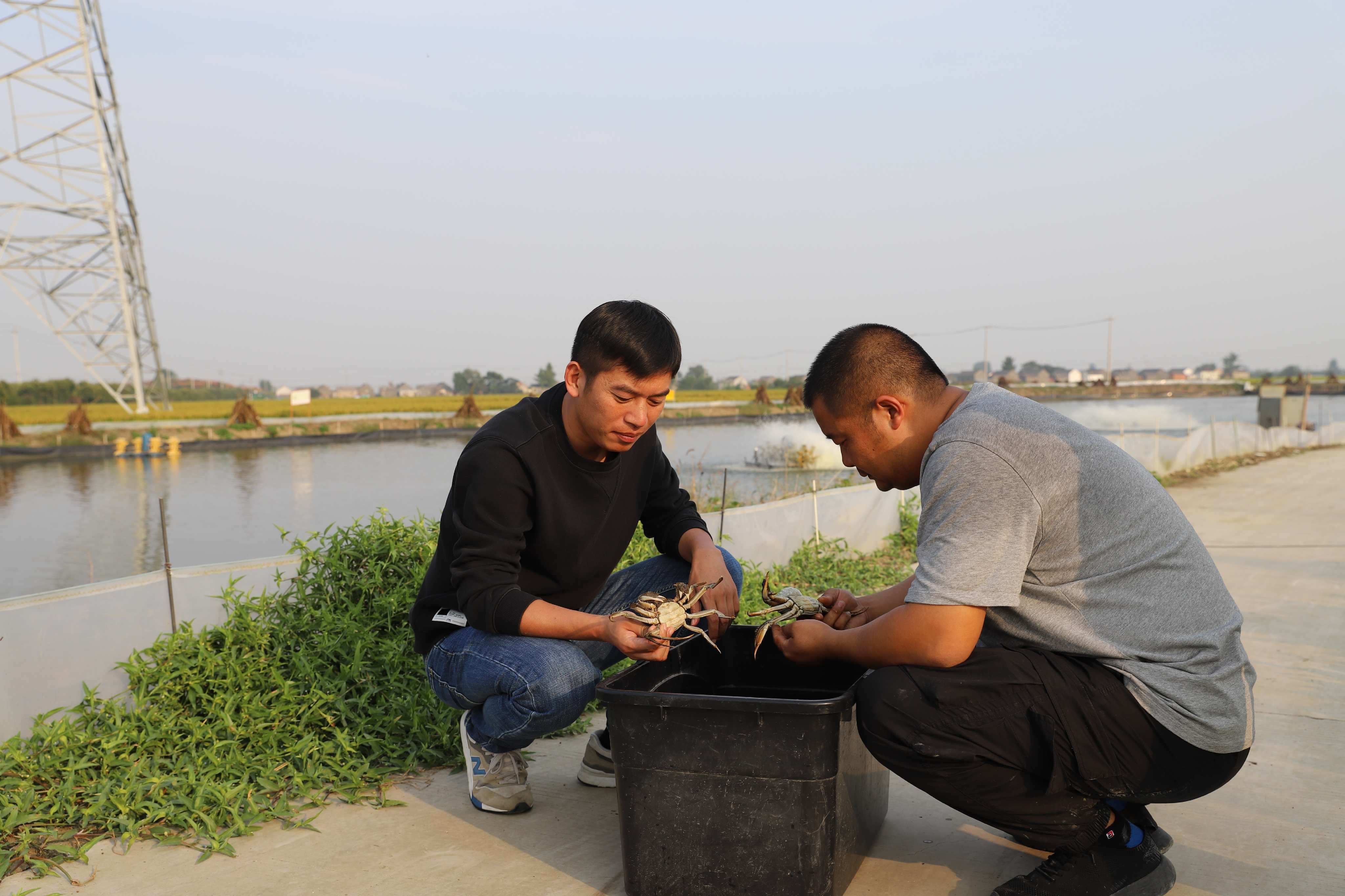 说话间,楼王镇凤南村党总支书记姚志刚,带着部分村组干部与种粮大户到田盛源农场学习稻蛙养殖成功经验,打算明年让部分农户搞稻蛙套种套养。今年38岁的姚志刚是位新农人。他大学毕业后从父亲手上接过100亩的蟹塘后,因为水质问题,蟹的品质始终上不去。他说,自从大纵湖与蟒蛇河的水质达标后,他和村里水产养殖户所养的大闸蟹品质一年比一年好,不仅销路好,价格也哧哧地往上涨。于是他联合30多家养殖户成立专业合作社,将大闸蟹与鱼虾蟹混养面积扩大到5000亩,亩纯效益均超5500元。在凤南村养殖户孙玉发的塘口,记者见到他与批发商正在快速成交着一笔笔生意。他从箱子里拿出一只青背金爪的大闸蟹对记者说:“同样是一只三两五的母蟹,五六年前因为水质不太好蟹肚子上有黑斑,在塘口二十五块钱一只不好卖,现在水质好了蟹肚子洁白,四十块钱一只不够卖。”