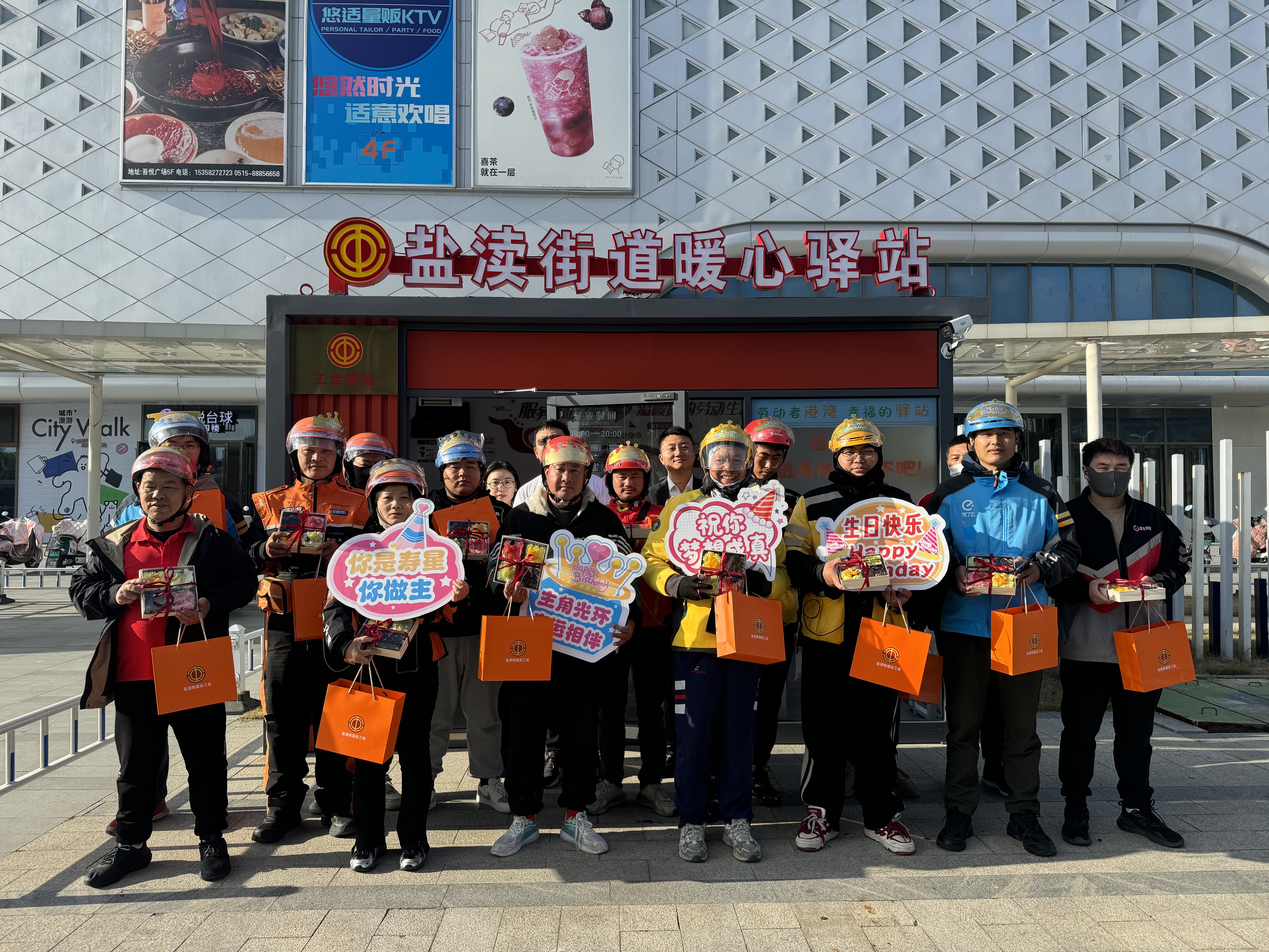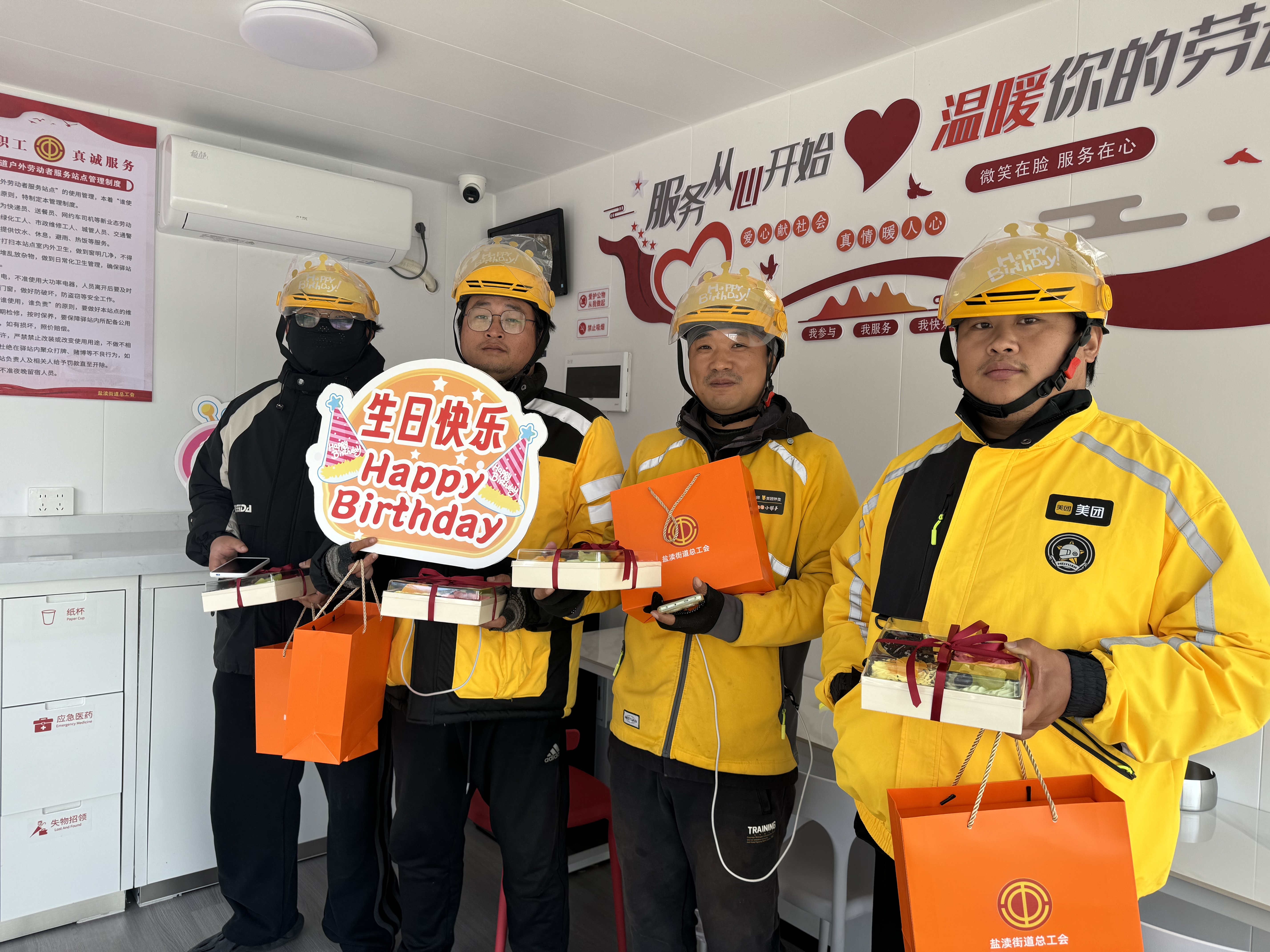 近日,在盐都区盐渎街道吾悦广场全新亮相的“工会驿站”里,欢声笑语,一场温馨而特别的集体生日会正在这里温暖上演。本次活动专为奔波在城市街头的快递小哥、外卖骑手等新就业形态劳动者举办,让这个新建的“小家”从启用之初就充满了爱与关怀。