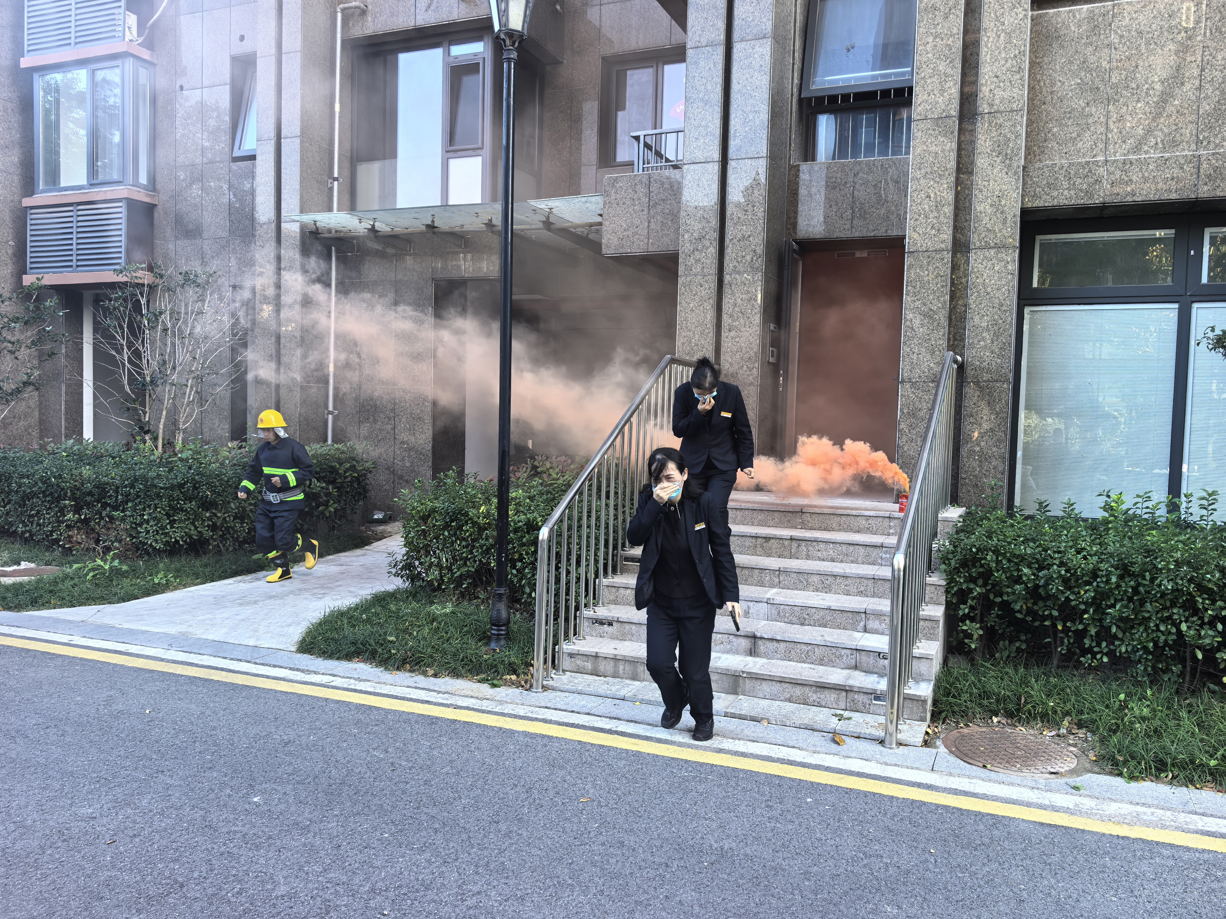 演练正式开始前,各项物资如干粉灭火器、消防桶、点火器材、自救呼吸器等均已准备就绪。随着模拟火警广播响起,疏散演练环节在大公馆5号楼准时启动。参演的工作人员从四楼通过楼梯间有序向下疏散。微型消防站队员迅速就位,按照预案敞开一楼安全出口大门,并释放消防烟罐模拟真实火场环境。全体人员用湿毛巾或口罩掩住口鼻,弯腰低姿,沿楼梯右侧迅速撤离至东门指定集结点,集合后各部门清点人数,确保全员安全撤离。整场演练过程紧张有序,用时约5分钟。