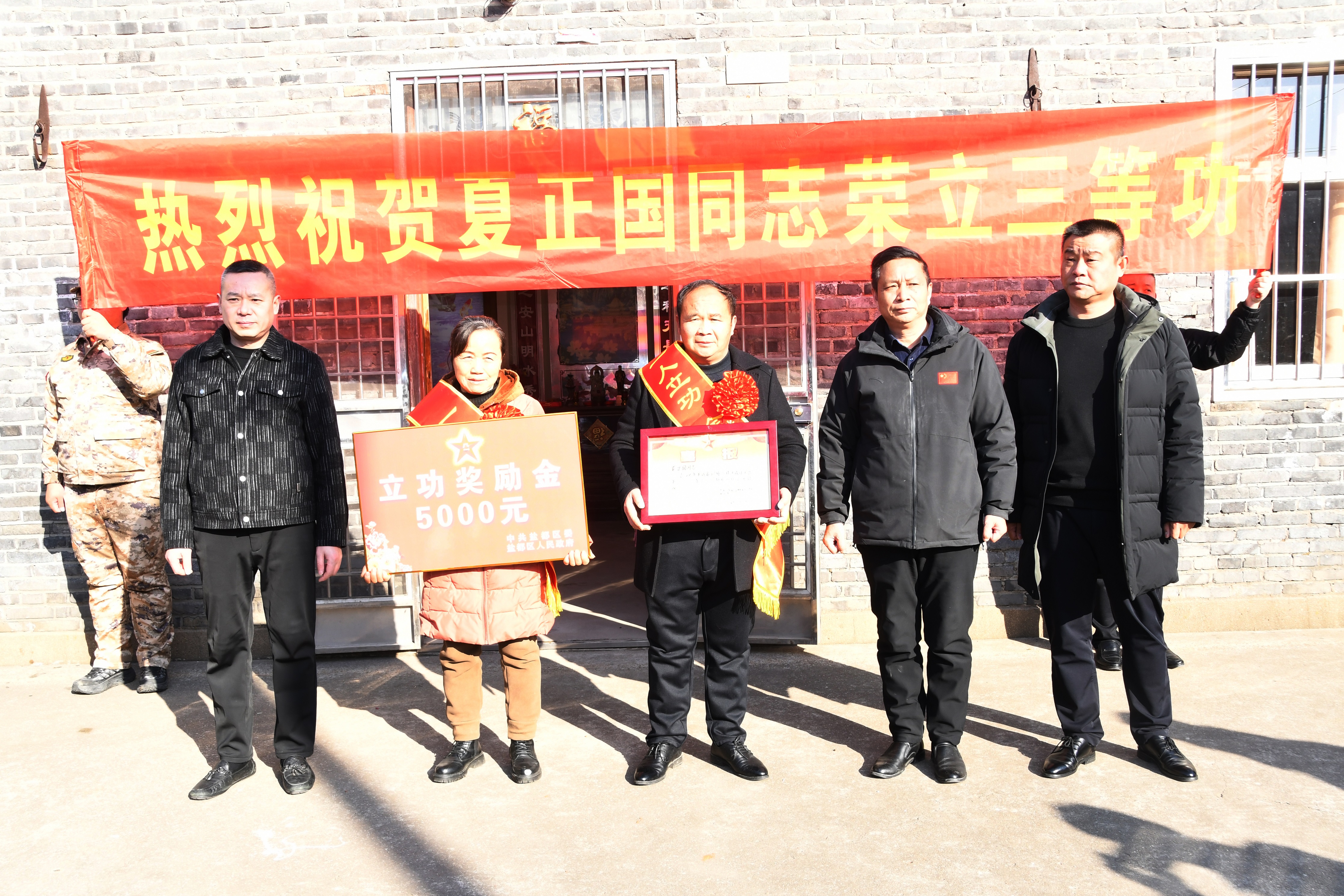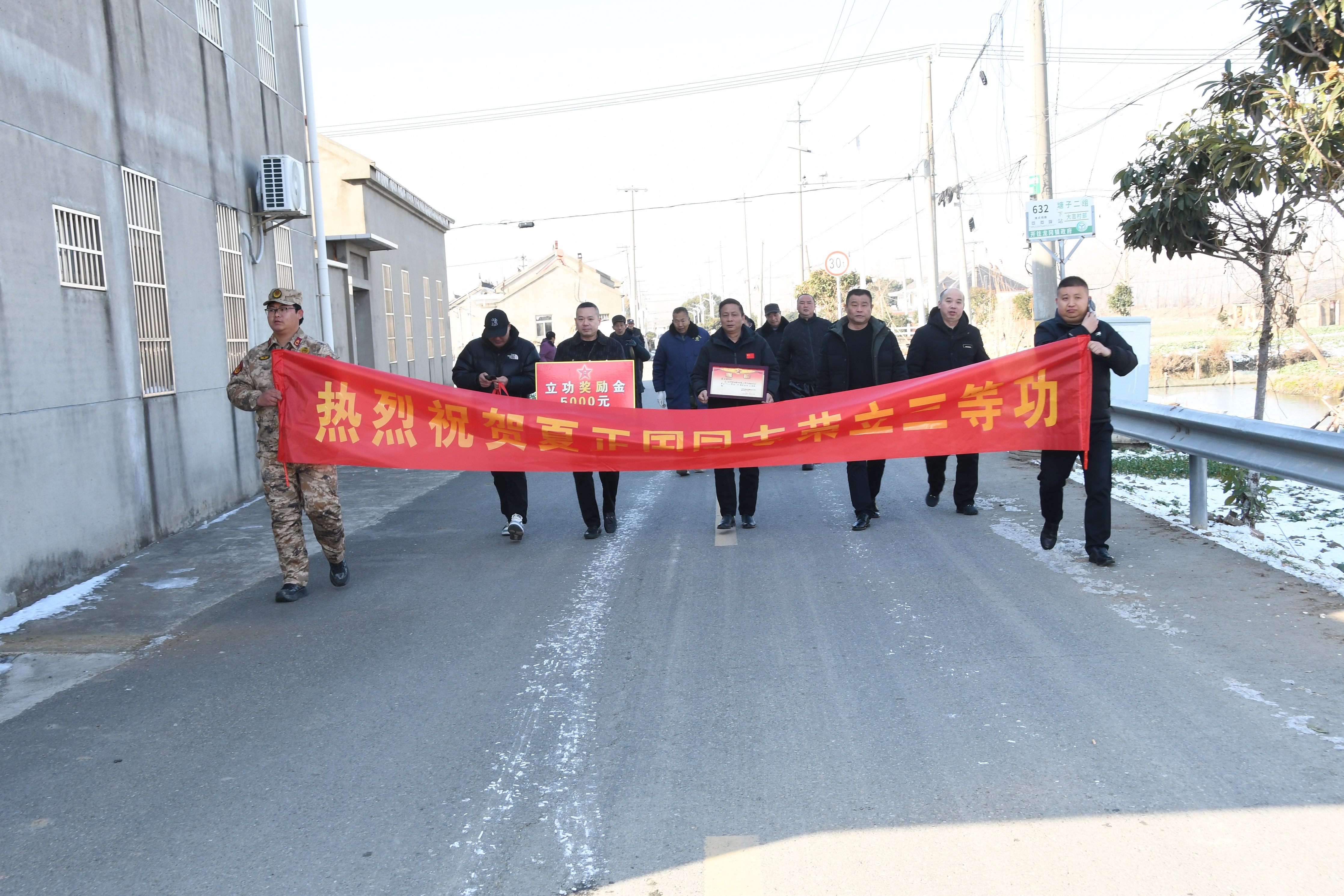 锣鼓喧天传喜讯,锦旗熠熠映初心。1月22日上午,盐都区退役军人事务局联合龙冈镇人武部、镇退役军人服务站组成“报喜团”,带着沉甸甸的荣誉与关怀,一路敲锣打鼓走进龙冈镇大吉村,将现役军人夏正国立三等功的喜报郑重送到其家人手中,让“一人立功,全家光荣”的自豪感在乡邻间传递,为冬日里的乡村增添了浓厚的尊崇氛围。