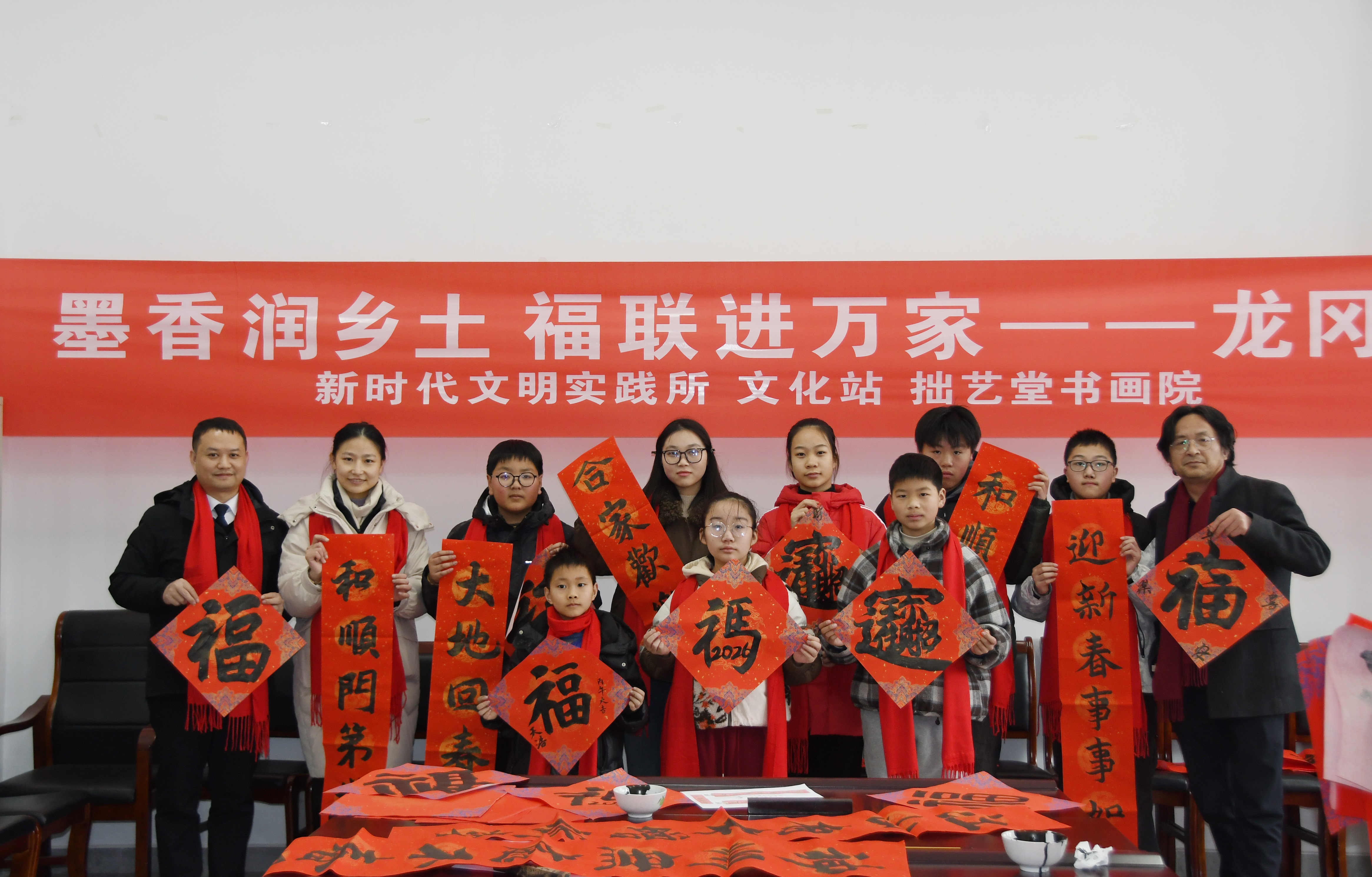 为传承中华优秀传统文化,营造喜庆祥和的新春氛围,2月9日下午,由盐都区龙冈镇新时代文明实践所、文化站、拙艺堂书画室共同举办的“墨香润乡土福联进万家”活动在凤凰社区热闹开展,一群“小书法家”,现场挥毫泼墨,用笔墨为居民送上新春祝福。