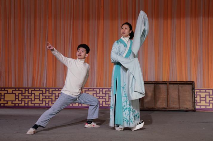 (在盐城市淮剧团排练厅内,为进京展演精心打磨的淮剧正在紧张有序地排练中。左为邢琛、右为房小莉。丁嘉怡摄)
