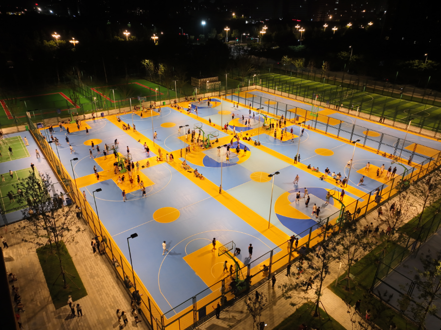 篮球高高抛起,两边你争我抢、挥汗如雨,诠释出青春最具活力的模样;红色的健身步道上有的慢跑、有的散步;羽毛球场上,挥拍、接球,亲子齐上阵,共享健身乐趣……全民健身中心无论白天还是夜晚都是人头攒动。