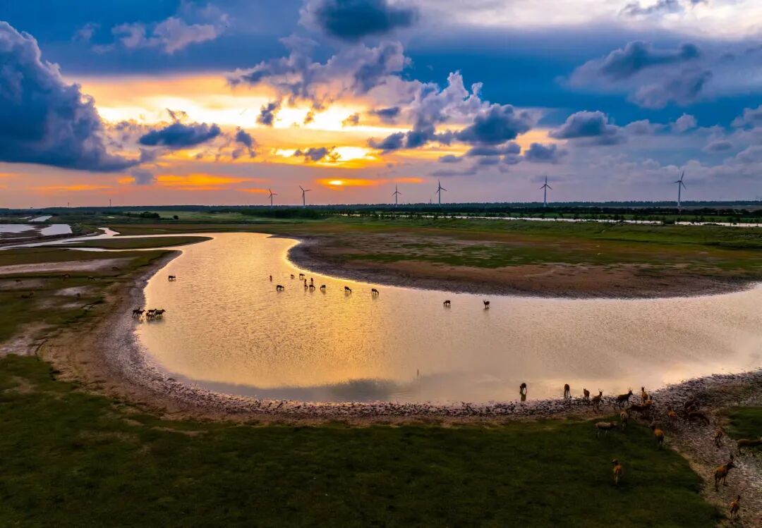沿着五彩斑斓的旅游1号公路一路向北,便到了全国第二批美丽海湾优秀案例地川东港。这里位于大丰区东南部沿海,海岸线19.2公里,总面积158平方公里,拥有良好的自然生态禀赋和珍贵的近海与海岸湿地等多样化湿地资源,包括野鹿荡、南建川区生态修复区、江苏大丰麋鹿国家级自然保护区等区域。在这里,抬头可见成群的麋鹿在嬉戏觅食;极目远眺,水清滩净、鱼鸥翔集的湿地美景尽收眼底。虽已是秋日,这里依旧水草丰茂,透过车窗,可以看到远处的麋鹿正在悠闲散步,更有各类珍稀鸟儿在此栖息觅食。江苏大丰麋鹿国家级自然保护区管理处副主任刘彬告诉记者:“从1986年39头到今年,我们麋鹿总数达到8216头,野生的达到3556头,种群数量稳定增长。”这片湿地上还分布着284种鸟类、24种兽类,其中国家一、二级重点保护动物52种。刘彬介绍,根据近两年监测,各类鸟类种群数量也在不断增长中。