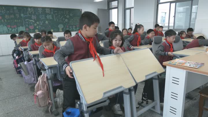 在杭集中心小学,新配置的课桌椅只需简单操作,桌面便能向上调节至45度,方便同学们午休。