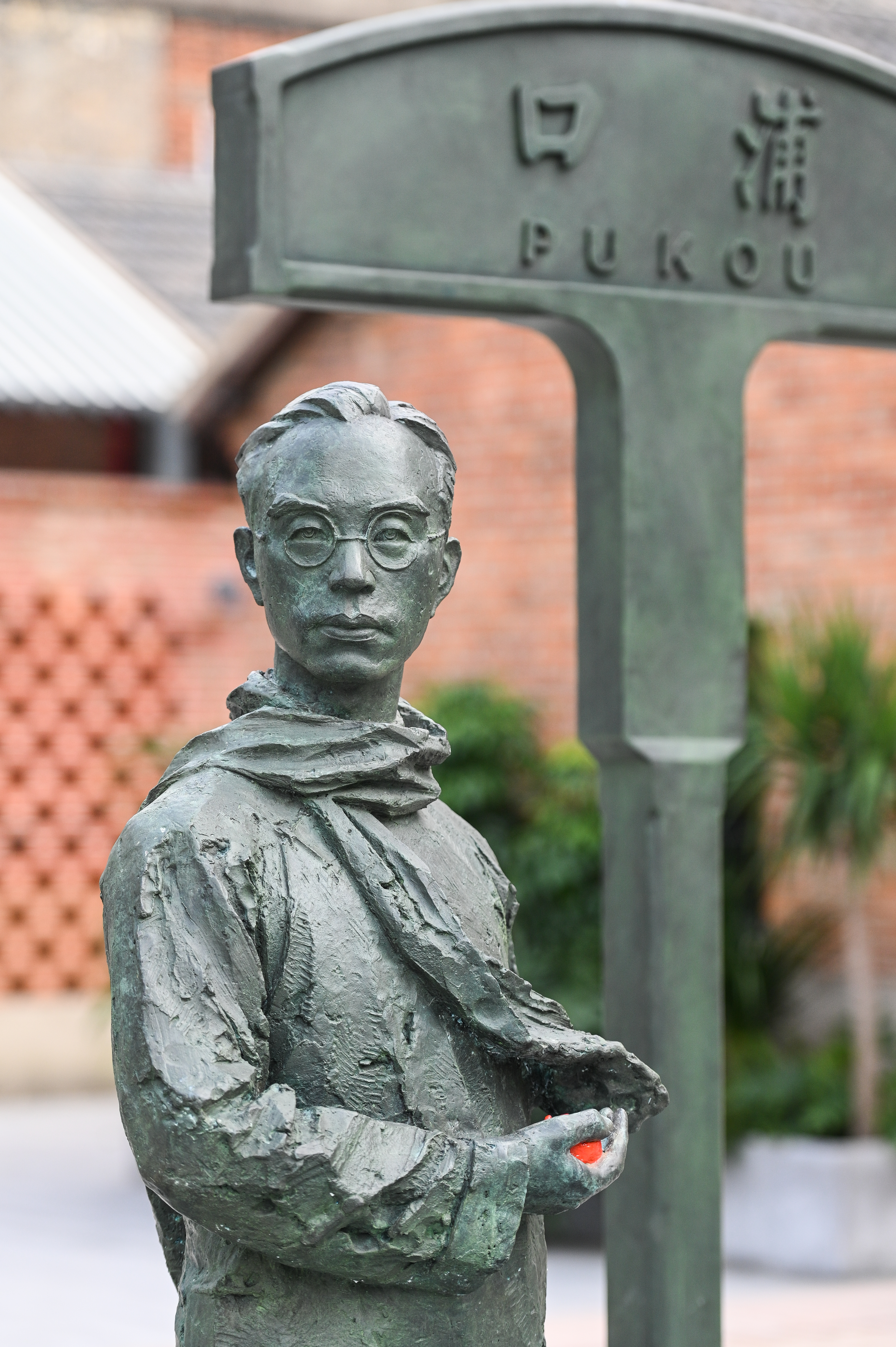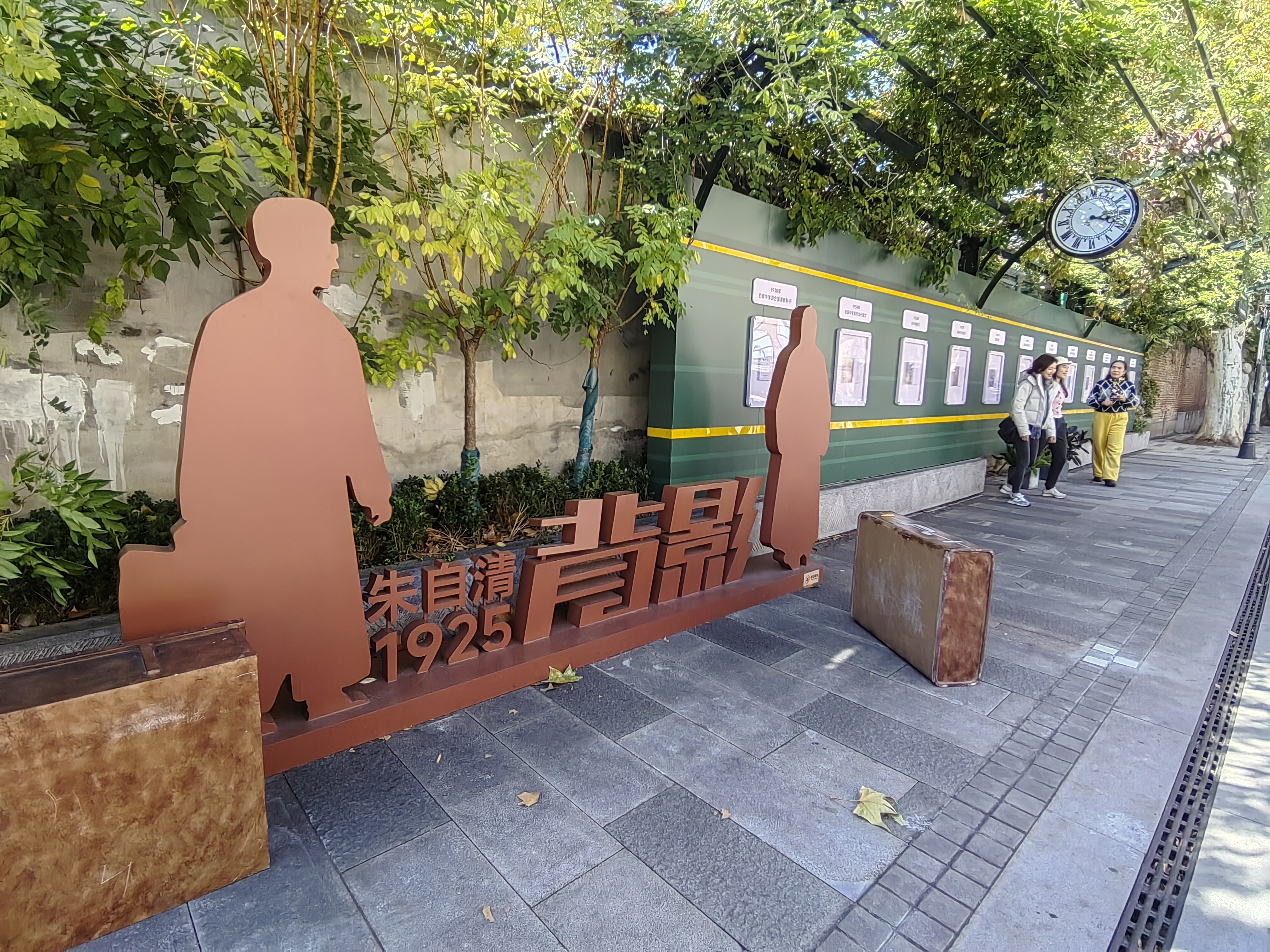 街区小广场上,由雕塑家陈建华创作的朱自清雕塑是游客们不会错过的“打卡点”,面容清癯的朱自清身穿长衫,裹着围巾,左手提行李箱,右手捧着橘子,朱自清嫡孙朱小涛撰写的雕塑铭文,向人们讲述着《背影》蕴含的亲情;《背影》之所以深入人心,除了其本身的魅力外,还在于其从上世纪三十年代就被选入了课本,成为万千中国人耳熟能详的散文名篇。“浦口火车站街区”特地打造了一面“《背影》课本墙”,陈列着从上世纪30年代到2017年的不同年代的收录《背影》的语文课本,吸引着不同年龄的游客在这里拍照留影。