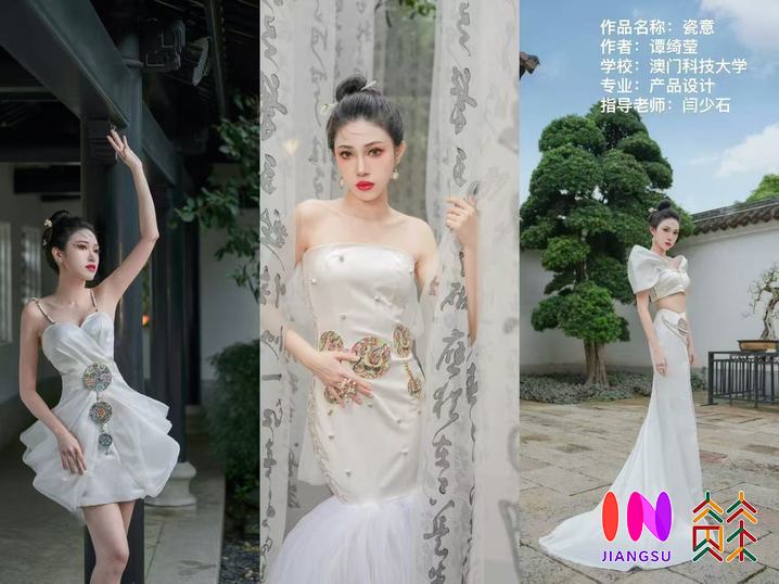 在梁倩婷展现作品中文化交融的同时,闫少石也在鼓励学生用现代语言赋予传统艺术新的生命力。她指导学生将广彩非遗技艺融入服装设计,“通过设计创新,我们希望让非遗传承在日常生活中焕发新活力,以年轻人喜爱的形式延续它的魅力”。这套以广彩元素为核心的服装作品也在紫金奖中国(南京)大学生设计展上广受好评。