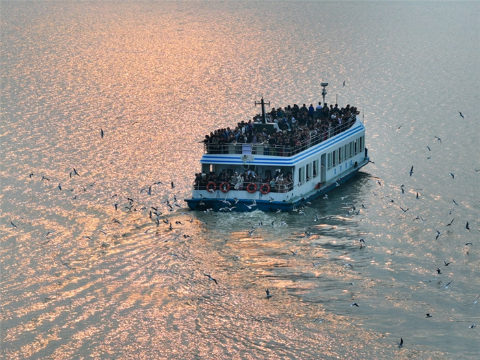 2024年12月24日傍晚,在鼋头渚游船的甲板上,面对水光潋滟处,落日与万只红嘴鸥齐飞的场景,新东方文旅集团董事长俞敏洪感慨:“冬日的太湖如此之美,看了以后心都醉了。”