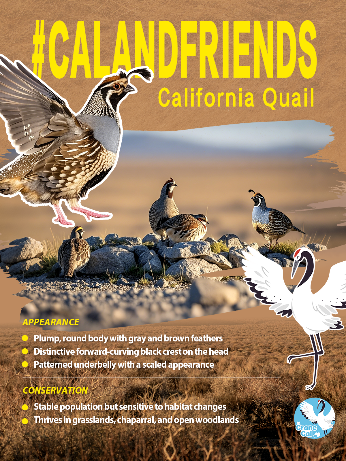 珠颈翎鹑这位朋友要比丹顶鹤的身形小很多,其额头上弯曲的黑色冠羽增添了几分神秘与独特。两者虽同为鸟类,却在体形、羽毛以及生活习性上展现出截然不同的风采,共同构成了自然界中一道亮丽的风景线。