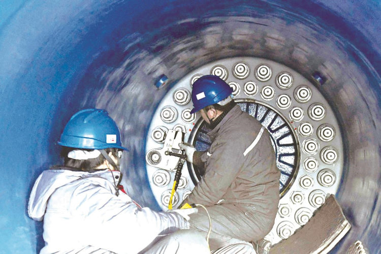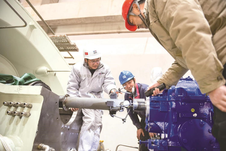 17米运转层开阔敞亮,庞大的汽轮机设备已安装到位,嘈杂的机器声与工人的交流声交织在一起。尹家瑾动作娴熟地爬上机器,打出清晰的手势,经验丰富的工友在另一头迅速响应,开始了汽轮机安装中极为关键的环节——拨动转子对着百分表校验。转子缓缓转动,百分表的指针随之微微跳动。“春节期间,我们的工作重点就是进行汽轮机设备的轴系调整,这个对精准度要求极高,通过设备加持,精准度要达到0.01毫米。”尹家瑾边说,边目不转睛地盯着3只百分表,让工人不断调整转子的力度和方向。车间里,还有几十名工人各自分头忙碌着。