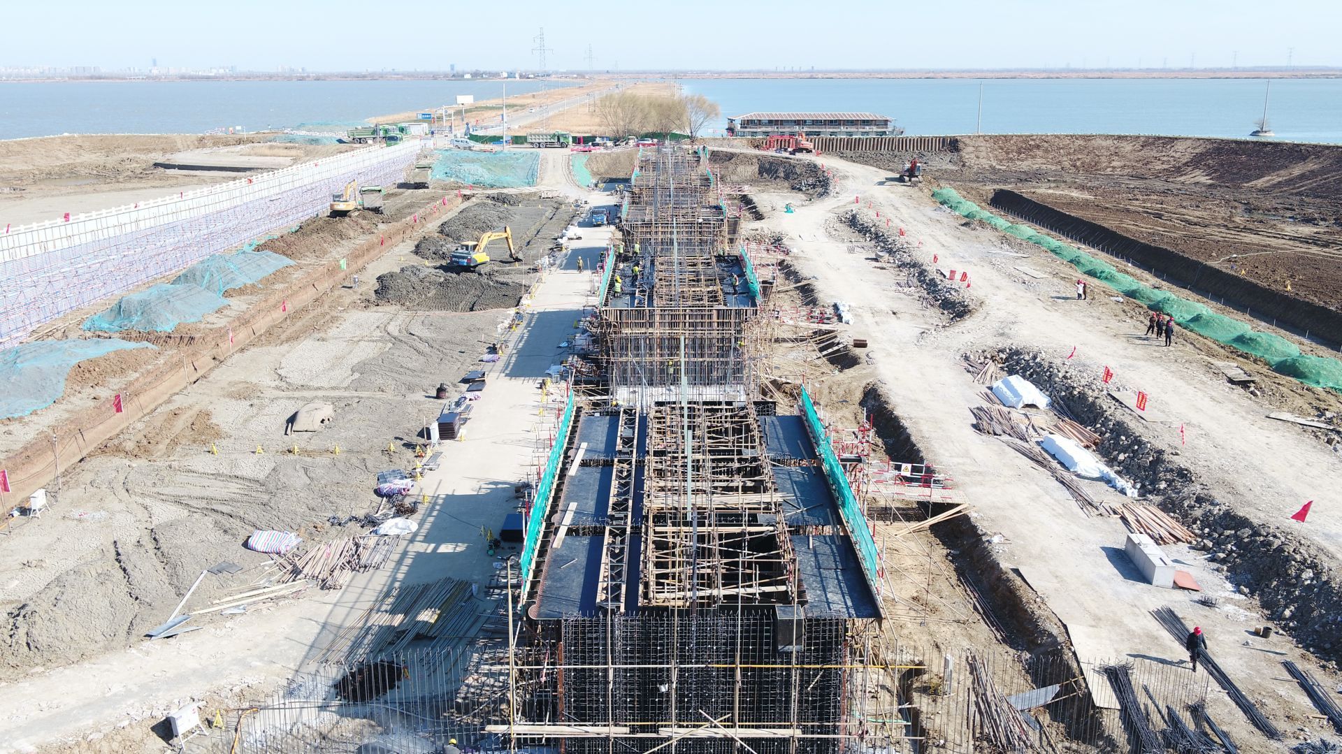 昨天上午,记者走进淮河入江水道右堤廖家沟(文昌大桥至羊尾巴段)应急加固工程施工二标,虽然天气寒冷,工程现场却一派繁忙景象。两道110米长、5米宽的围堰间,数辆挖掘机正挖掘着土方,伴随着机械的阵阵轰鸣,工人们正在紧锣密鼓地进行站身钢筋绑扎作业和消力池封底。
