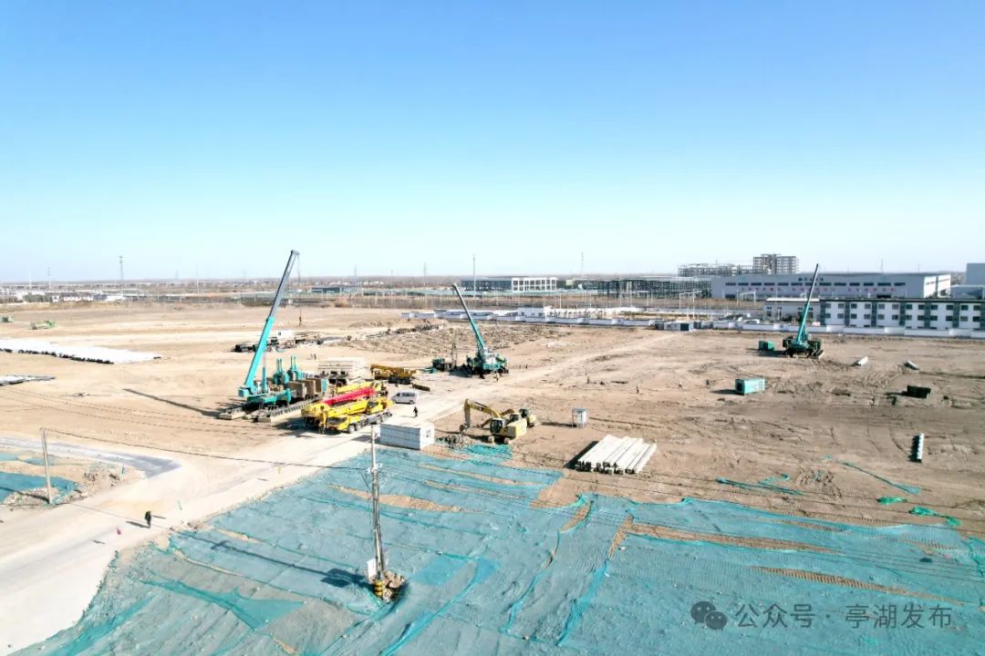 在盐城农副产品加工交易园区吾德央厨加工项目建设现场,塔吊平稳运行,施工人员有序作业。