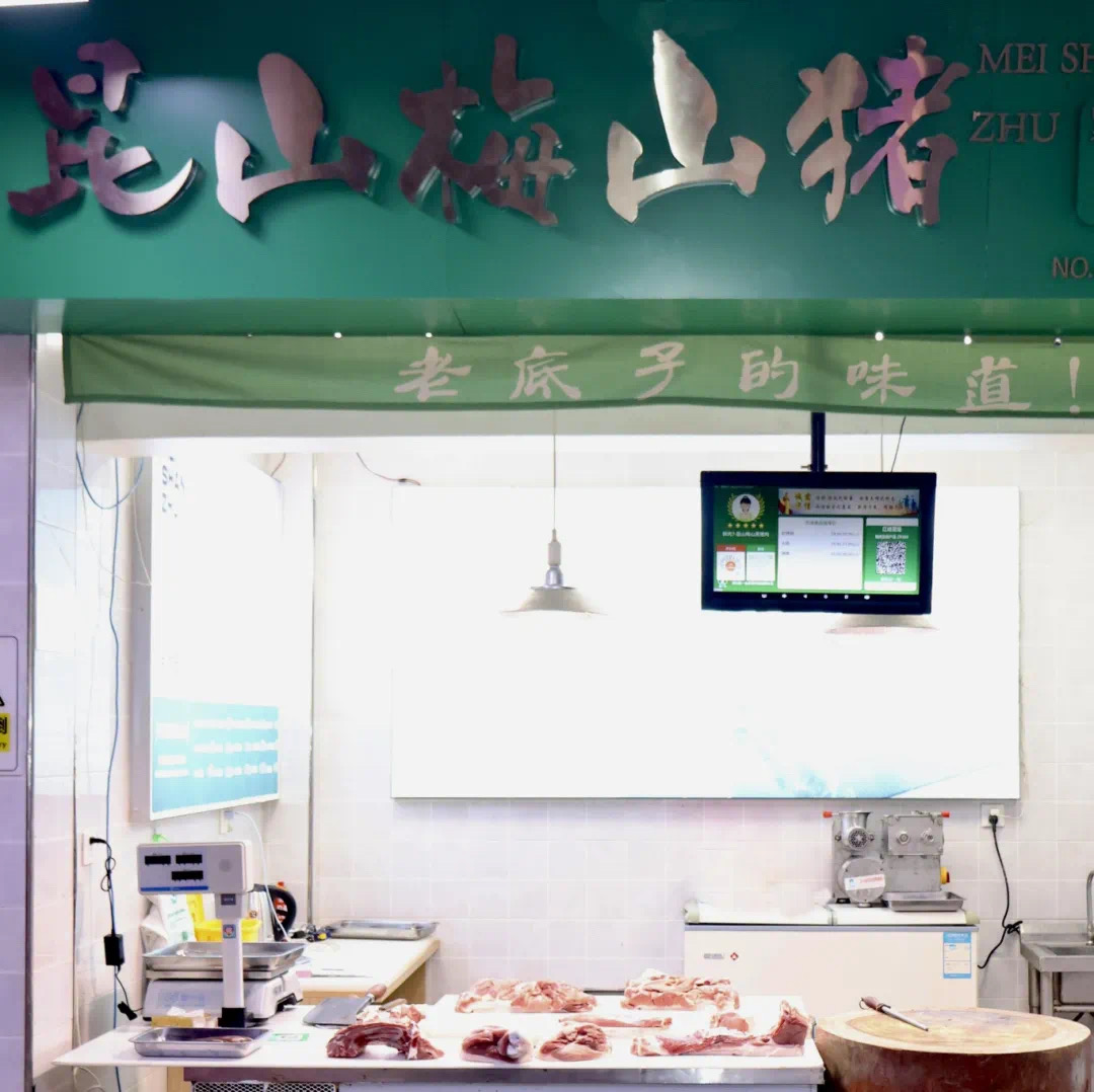 以梅山猪为例,这正是昆山最具特色的“土味”农产品之一,昆山梅山猪生活的地方在国家级保种场名单,其遗传资源保种场成功获评国家级畜禽遗传资源保种场称号。在昆山玉龙菜场和红峰菜场内,各有一家梅山黑猪肉的专营店。尽管梅山黑猪肉价格比普通白猪肉价格翻一番,但基本上只需一个上午的时间,每个门店的商品都会售空。