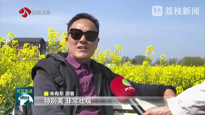游客朱有东说:“蓝蓝的天,衬上金黄的油菜花,特别美,非常壮观。”