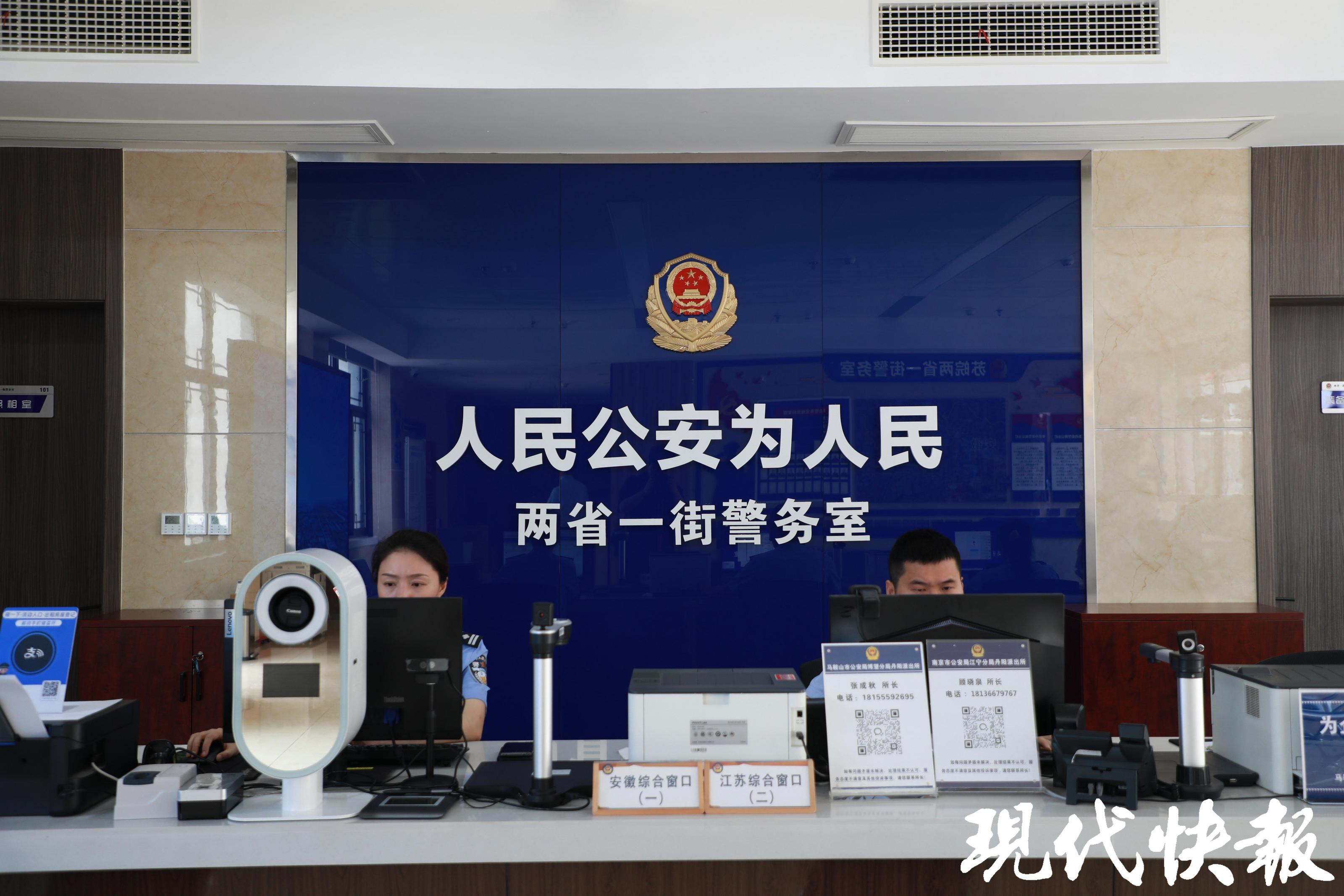现代快报讯(记者卢河燕/文顾闻/摄)江苏省南京市江宁区横溪街道丹阳社区,安徽省马鞍山市博望区丹阳镇,拥有同样的地名、相通的街道,“一脚踏两地、鸡鸣闻两省”是这里最具特色的场景。5月27日,现代快报记者在位于两省交接处的苏皖“两省一街”警务室看到,两地公安政务服务窗口紧挨着,两地警务人员“坐一起”办公,实现两省群众“进一扇门,办两省事”。
