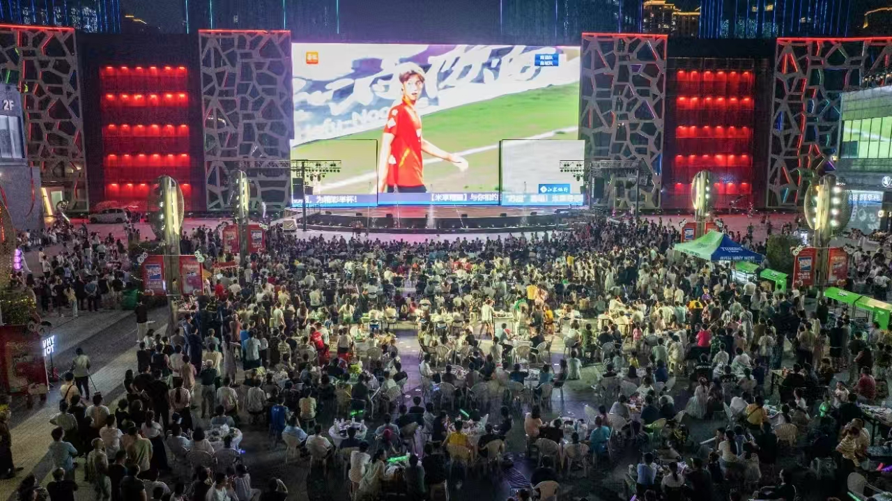6元一杯的西瓜汁、50元三斤的小龙虾、10元一盒的卤鸡爪……D·A艺术街区下沉广场的美食供不应求。在现场大屏前,足球比赛成为人们欢乐一夏的由头,快乐是一切的核心。“在家里吹着空调看比赛,虽然凉快,但缺少了这种大家一起呐喊、一起欢呼的氛围。在这里,和众多球迷一起为支持的球队加油,感觉特别带劲!”市民徐女士和同事专程驱车赶来,为看球、为美食、为快乐。