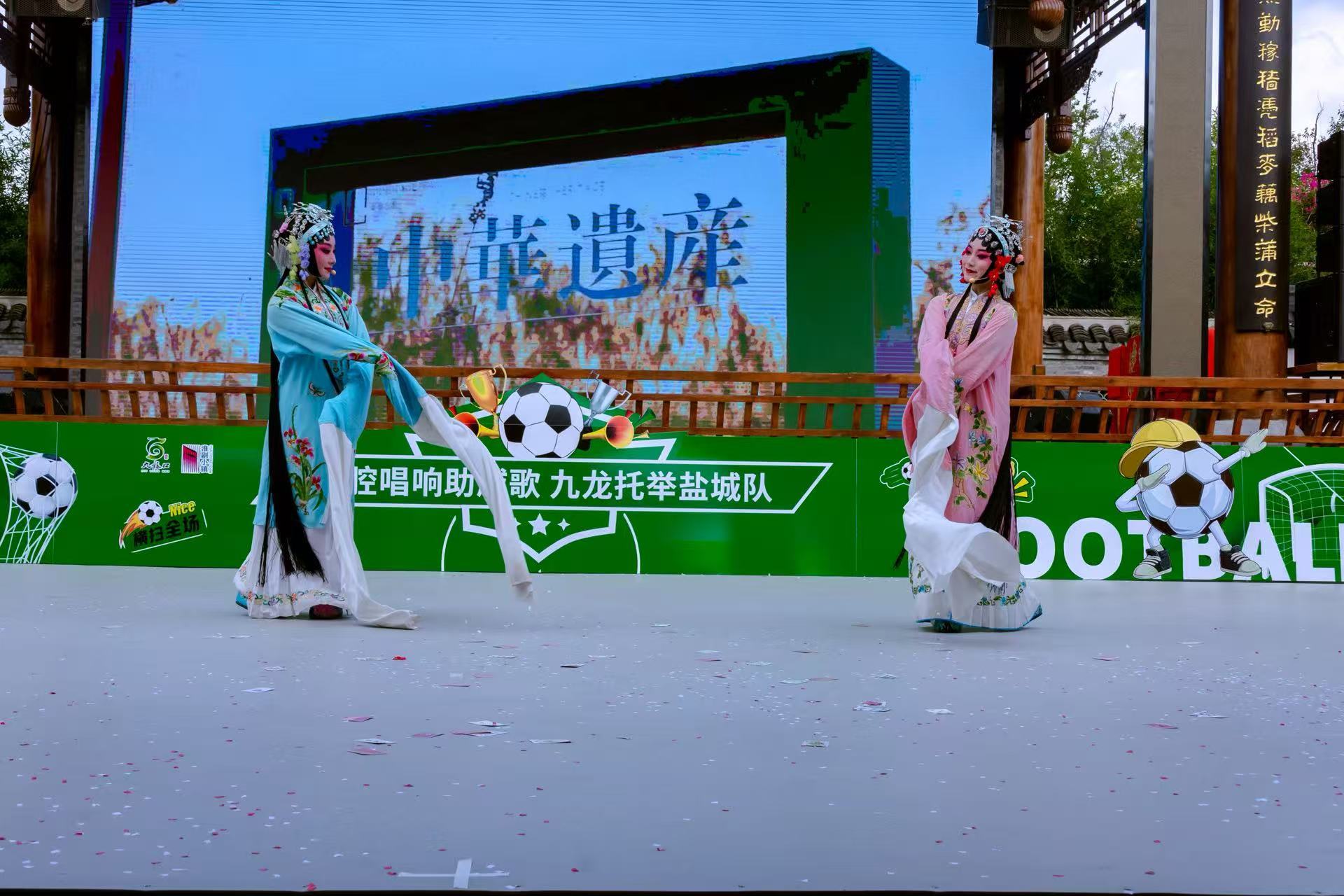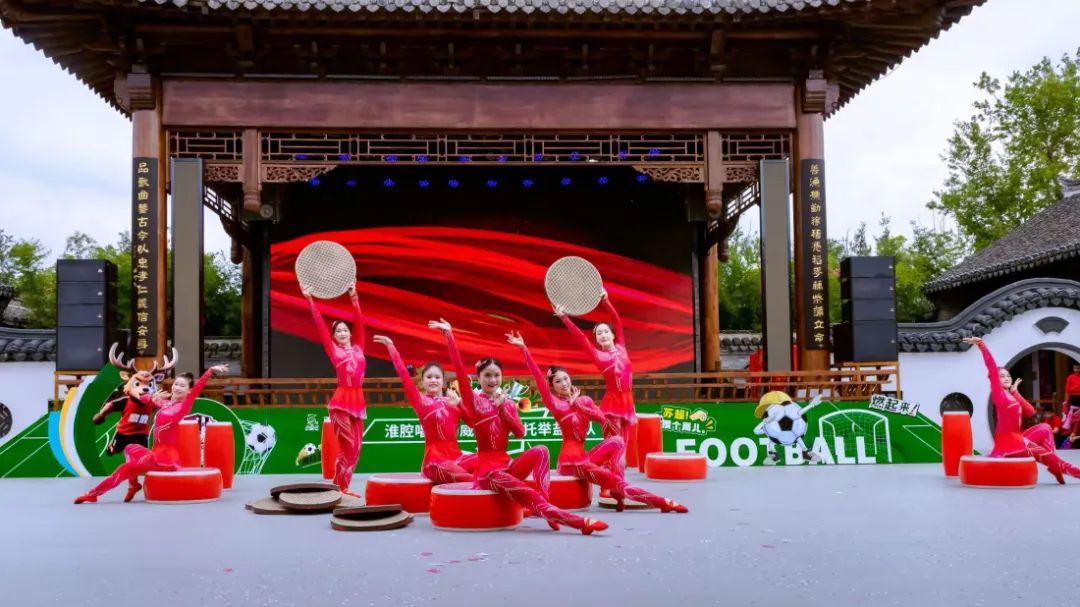 最后,由淮剧小镇创排、融合音乐、舞蹈、淮剧、杂技等多种艺术形式的音舞诗画《燃动盐城》,将现场气氛推向高潮,展现盐阜大地的千年文脉与时代活力的同时,为苏超足球联赛盐城队加油助威。