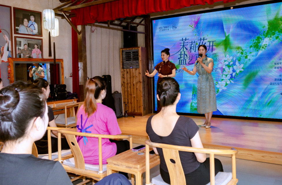 活动当日,“一堂匠艺”名家课堂率先开讲。国家一级演员陈澄与结对市文艺名家蔡娟,在淮剧研习社为淮剧爱好者们带来了一场精彩的“淮剧传承与发展”专题讲座。通过对淮剧发展史的深入讲解、经典唱段的示范教学以及现场互动指导,为基层淮剧爱好者搭建了宝贵的学习与交流平台,让淮剧艺术的种子在基层沃土中深植、发芽。