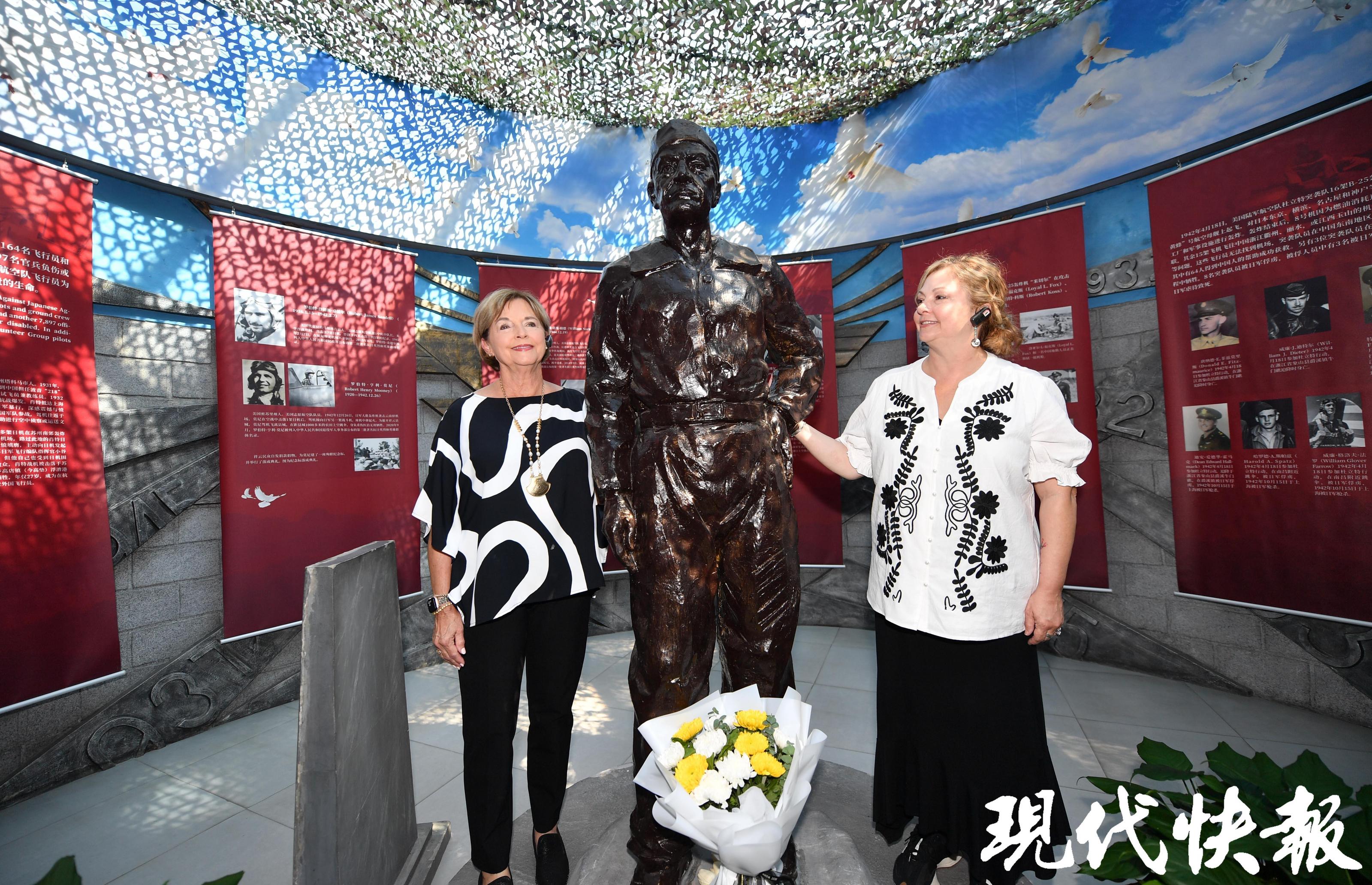 在展厅内的陈纳德雕像前,美国飞虎队创始人陈纳德将军外孙女嘉兰蕙(NellChennaultCalloway)及重外孙女罗宾斯(RobinCallowayMeadows)