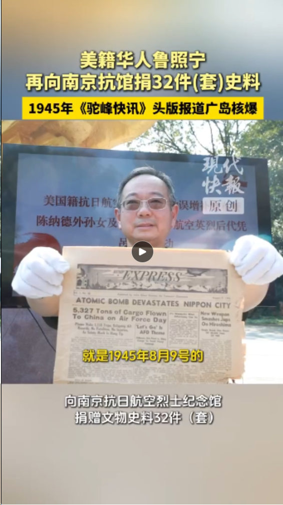 鲁照宁捐赠32件(套)文物,1945年《驼峰快讯》头版记录广岛核爆