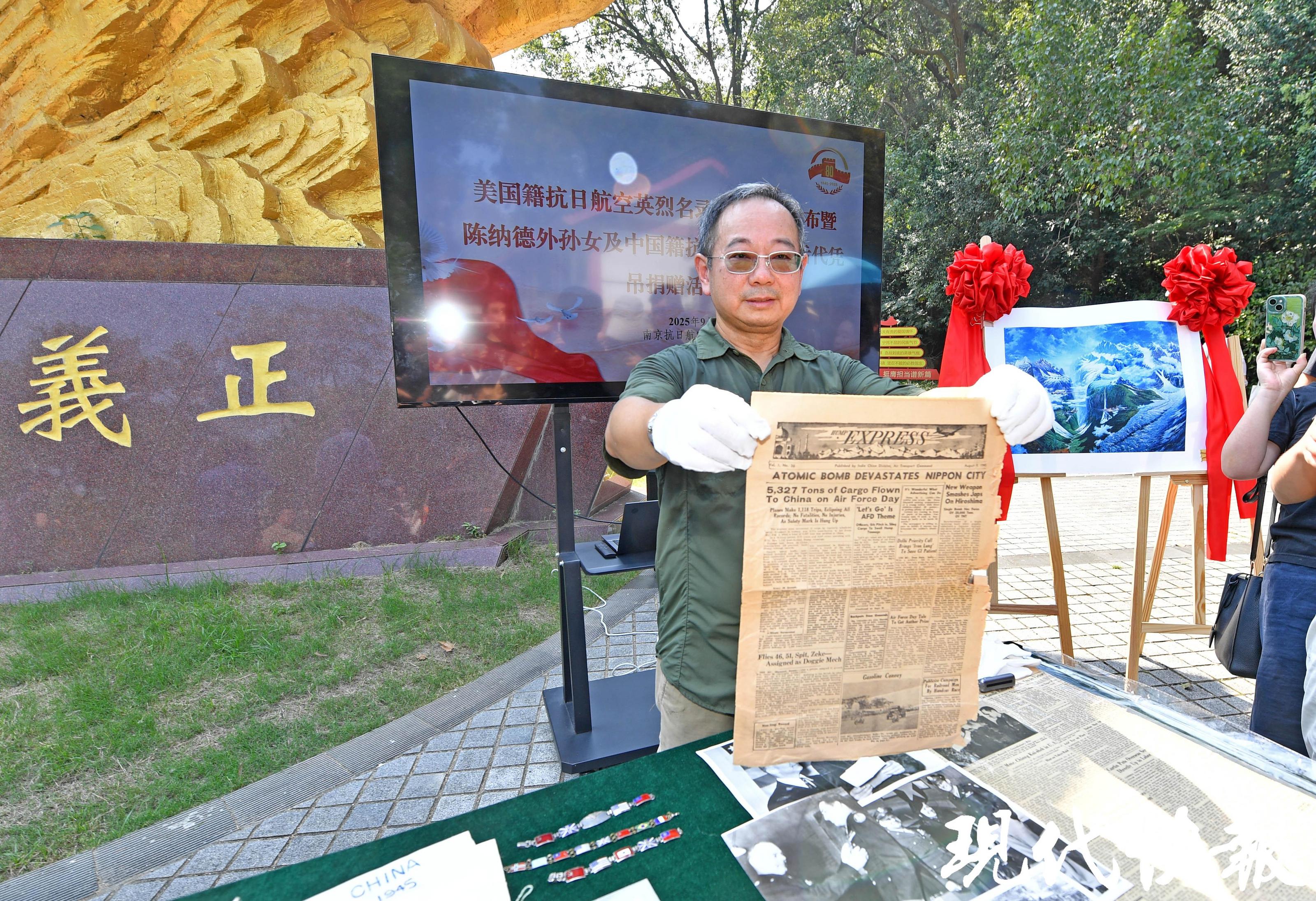 9月5日,南京抗日航空烈士纪念馆举行陈纳德外孙女及中国籍抗日航空英烈后代凭吊捐赠活动。当天,参加活动的有美国飞虎队创始人陈纳德将军外孙女嘉兰蕙(NellChennaultCalloway)及重外孙女罗宾斯(RobinCallowayMeadows),抗日航空英烈鲁美音侄孙、著名抗战史料捐赠人、美籍华人鲁照宁,中国籍抗日航空英烈陈端纮侄孙陈钢。