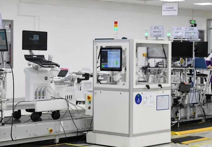 “平均4.5分钟‘下’一台机器,平均每天可生产100台不同配置的机器,承担了GE医疗全球40%的超声主机产能。”数字化赋能带来的精益化及柔性化升级,正在让这个占地500平方米的生产车间成为全球产量最大的超声主机工厂之一。