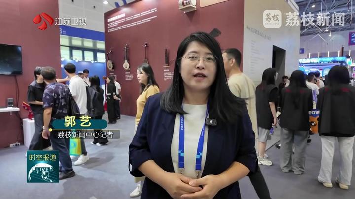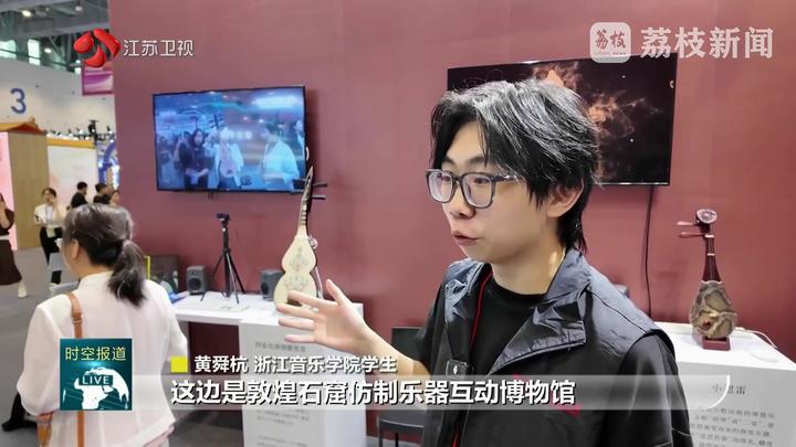 浙江音乐学院学生黄舜杭说:“这边是敦煌石窟仿制乐器互动博物馆,我们引入了声音感应、动作识别,以及视觉生成的技术,让观众通过触摸、弹拨,沉浸式体会那个时代的声音,真正听见这些壁画上沉默的古乐器。”