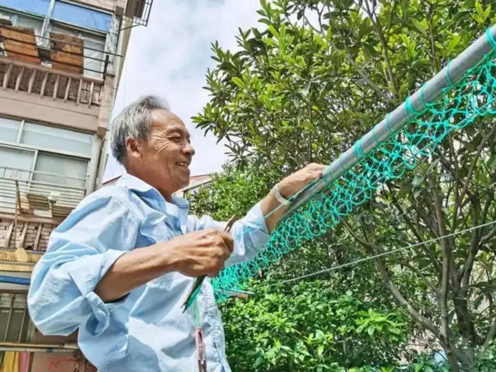 手握梳板,指捏梭子,77岁的张祖发动作如行云流水,尼龙绳在指间轻盈穿梭。不一会儿,一只精巧耐用的网兜悄然成型。张祖发经常会将这些亲手制作的网兜赠送给街坊邻居,还会为社区内的所有晾衣杆“穿上”定制的“渔网”,让大家可以把衣架更为牢固地挂在一个个网眼里。