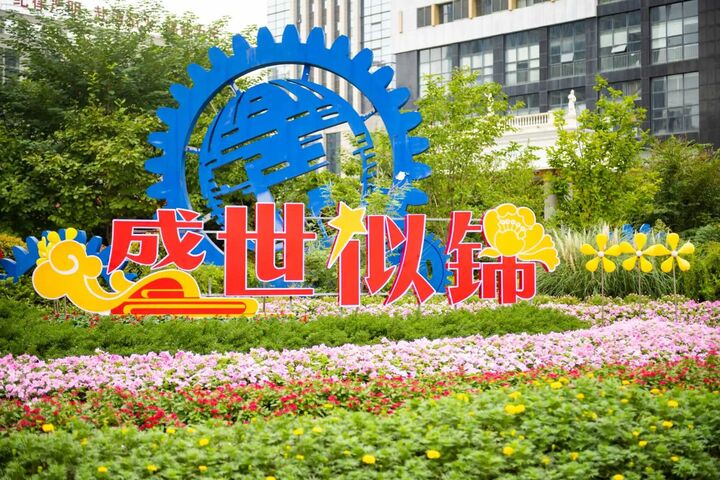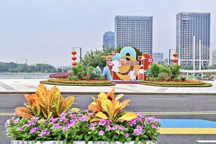 无锡滨湖区建筑路与鸿桥路交叉口,393.4平方米的景观区域格外引人注目。此次国庆氛围布置将各色应季花卉巧妙移植在原有景观小品周边,并增添了“盛世似锦”标识,传递着家国似锦、盛世繁荣的美好寓意。