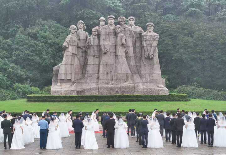 清晨的雨花台,松柏静默,群雕肃立。百余名新婚夫妇手持鲜花,缓步走向烈士就义群雕,在庄严的仪式中献上崇高敬意。默哀肃立,鲜花轻放,既是对烈士的深切告慰,也是对和平岁月的郑重承诺。