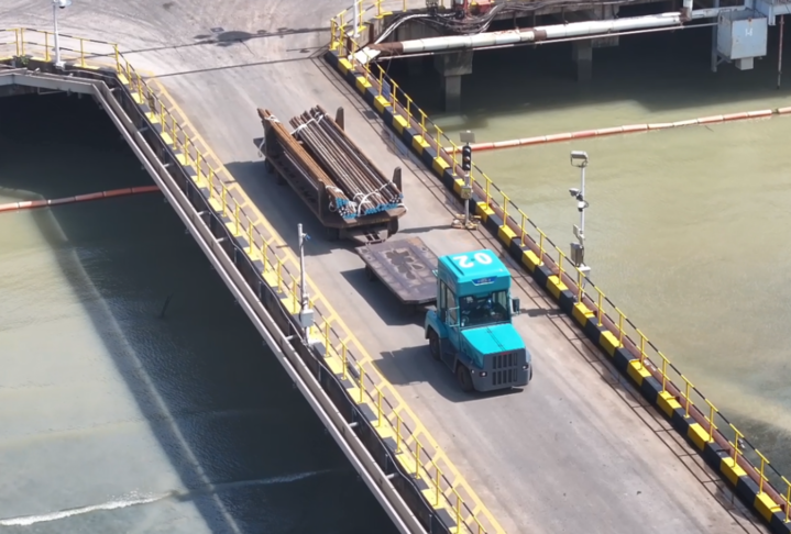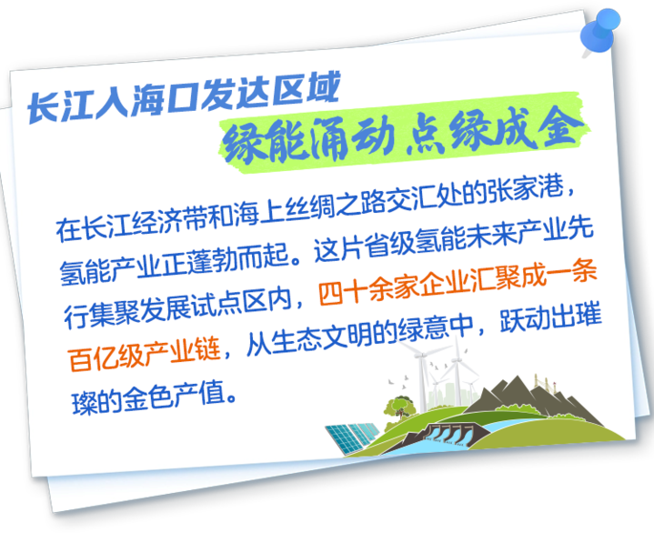 离开张家港湾,沿着长江岸线一路向北,翠绿的岸线与澄澈的江面交相辉映,另一派繁忙景象也映入眼帘——在张家港港集装箱码头,货轮在泊位上有序装卸作业,一辆辆氢燃料牵引车在堆场往来穿梭......