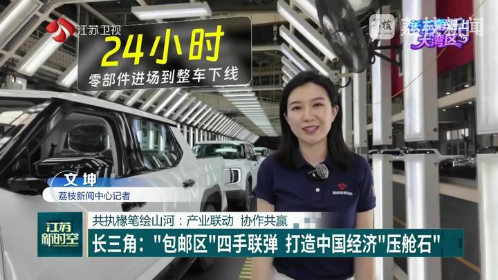 荔枝新闻中心记者文坤说:“这辆新能源汽车从零部件进场到整车下线,仅用了24小时:昨天上午,上海研发中心的工程师敲定了自动驾驶系统参数;中午,江苏常州的动力电池、苏州的车载显示屏就运到厂区;下午,浙江宁波的电机、安徽合肥的底盘部件陆续进场;今天一早,所有零部件在无锡的总装线汇合,现在它已经可以驶下生产线,准备交付客户了。这样的效率,不是偶然。长三角早已形成‘研发+制造+配套’的全链条汽车产业生态,可以说在半径四小时车程的‘包邮区’内,从硬件到软件,从设计到制造,新能源汽车所需的零部件全部都能配齐。”