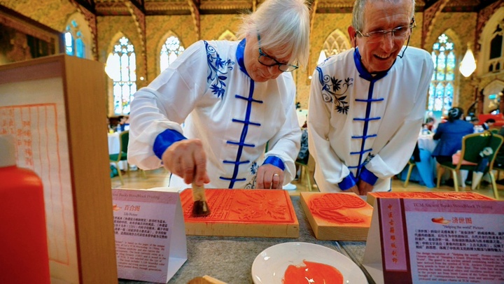 南京中医药大学带来的则是中医药文化和江苏“非遗”的碰撞。一盘盘精致小巧、形色诱人的药膳点心,一张张精美古朴的中医经典古籍书叶,引得大家纷纷驻足体验。南京中医药大学党委宣传部副部长刘丹青介绍,这次带来的金陵非遗药膳茶点灵感来自药食同源的中国饮食文化,印刷体验也是将中医药经典古籍和来自扬州的国家级非物质文化遗产雕版印刷技艺做了结合。“希望大家能在浓浓中国味道、书香气息中感受到中医药文化‘融入生命生活’的独特魅力。”NailaSharif议员亲手制作了南京中医药大学图书馆馆藏、入选《国家珍贵古籍名录》的中医养生学专著《尊生要旨》中的“八段锦导引图”书叶,“太美了,这简直是Art(艺术)!”她连连称赞,并表示要带回家中珍藏。
