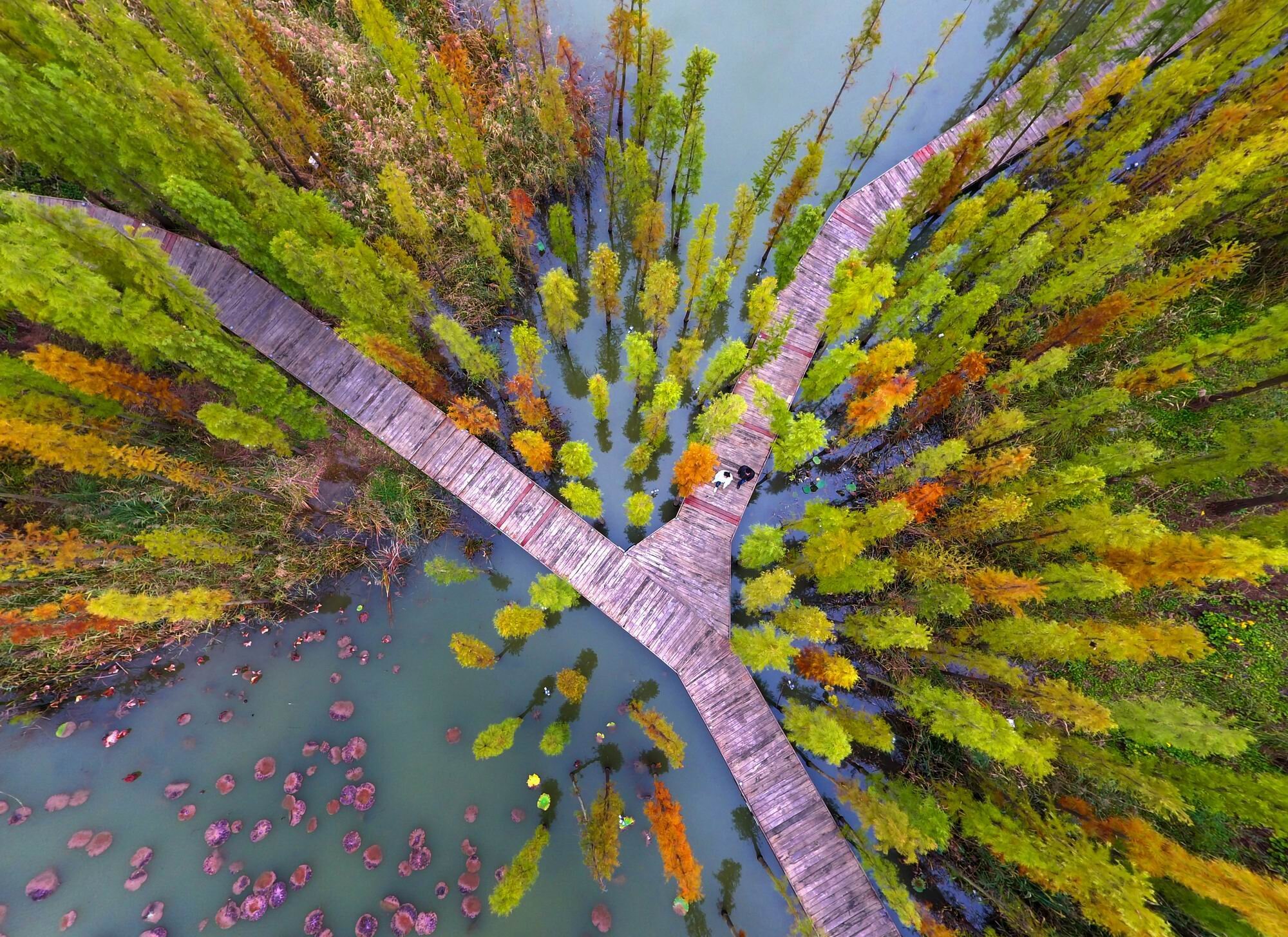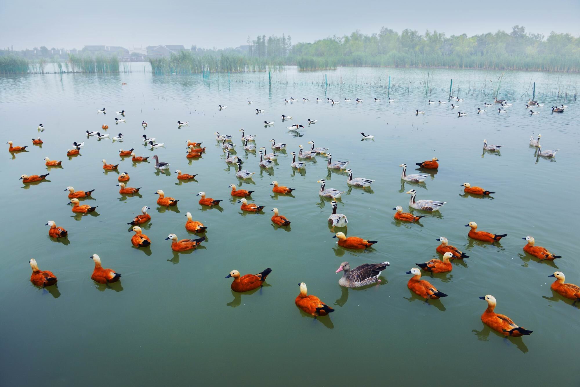 转机来自2010年,那年春天,贾汪区携手多家高校、科研单位,以“五位一体”的创新模式,在这片荒芜之地开始书写奇迹。村庄搬迁、土地整理、生态修复、湿地开发……他们不只是整治一片湖,更是修复一段人与自然断裂的关系。地形重塑、土壤再生、水体净化、植被重绿,塌陷的水域不再象征荒芜破败,而被巧妙转化为沼泽、浅滩、深潭交织的湿地廊道。芦苇、菖蒲、池杉林如一支支碧绿的笔,在水中写下生态复苏的诗行。鱼回来了,蛙鸣再起,鸟群纷纷落户——它们以翅膀投票,选择在这一片曾经被遗忘的土地上,安放它们的巢与歌。如今,这里栖息着青头潜鸭、小天鹅、东方白鹳等30多种国家重点保护野生动物、200多种鸟类和300多种植物资源,成为名副其实的生物多样性王国。