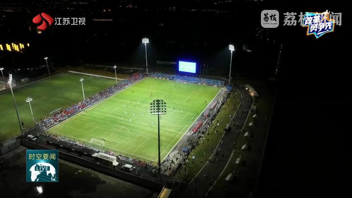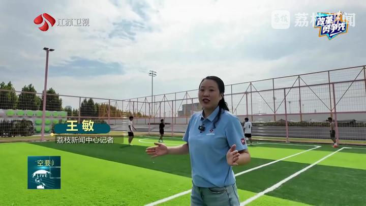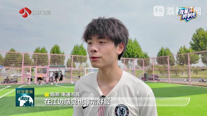 荔枝新闻中心记者王敏说:“踢着足球,吹着江风,在南通这个新投入使用的长江体育公园里,大家在球场上尽情地奔跑,享受着运动的快乐。”